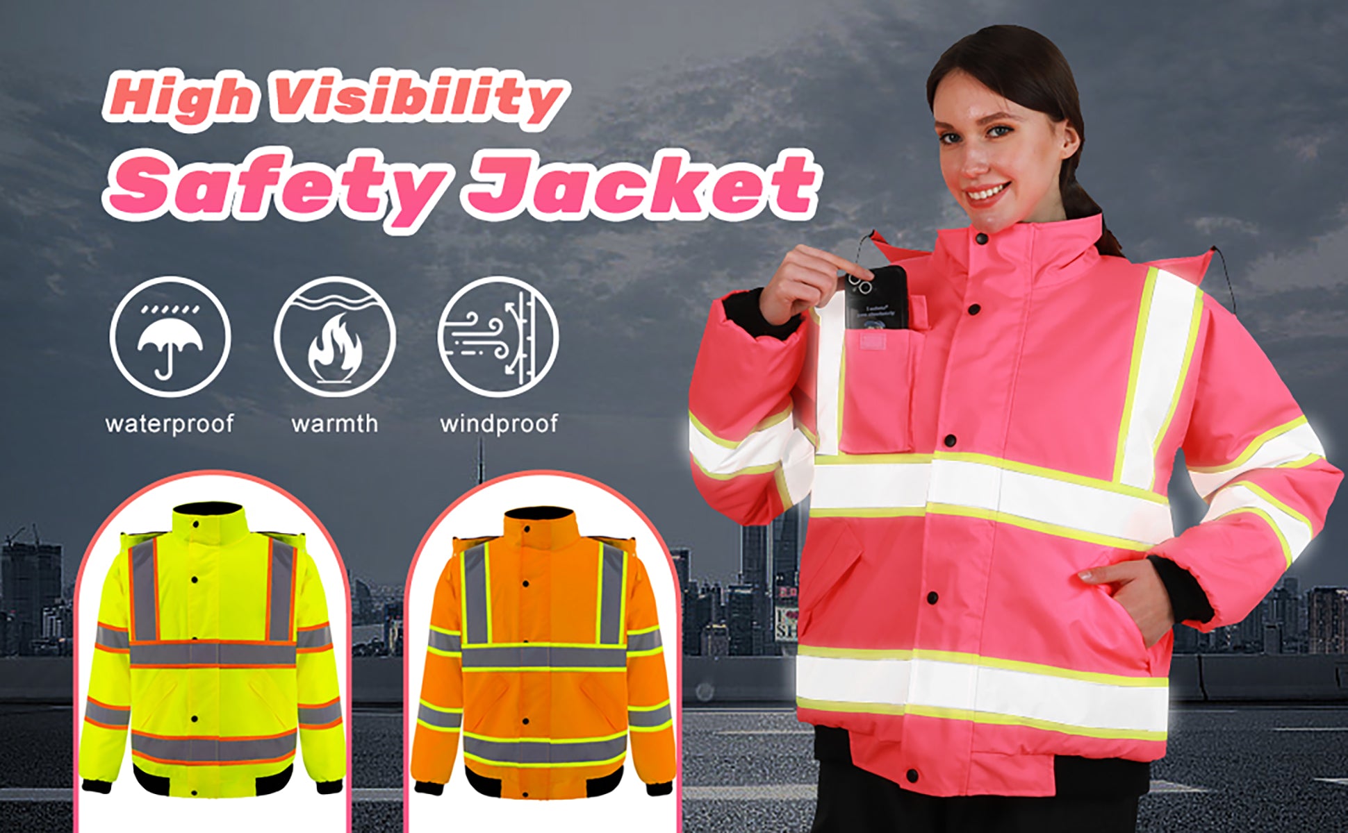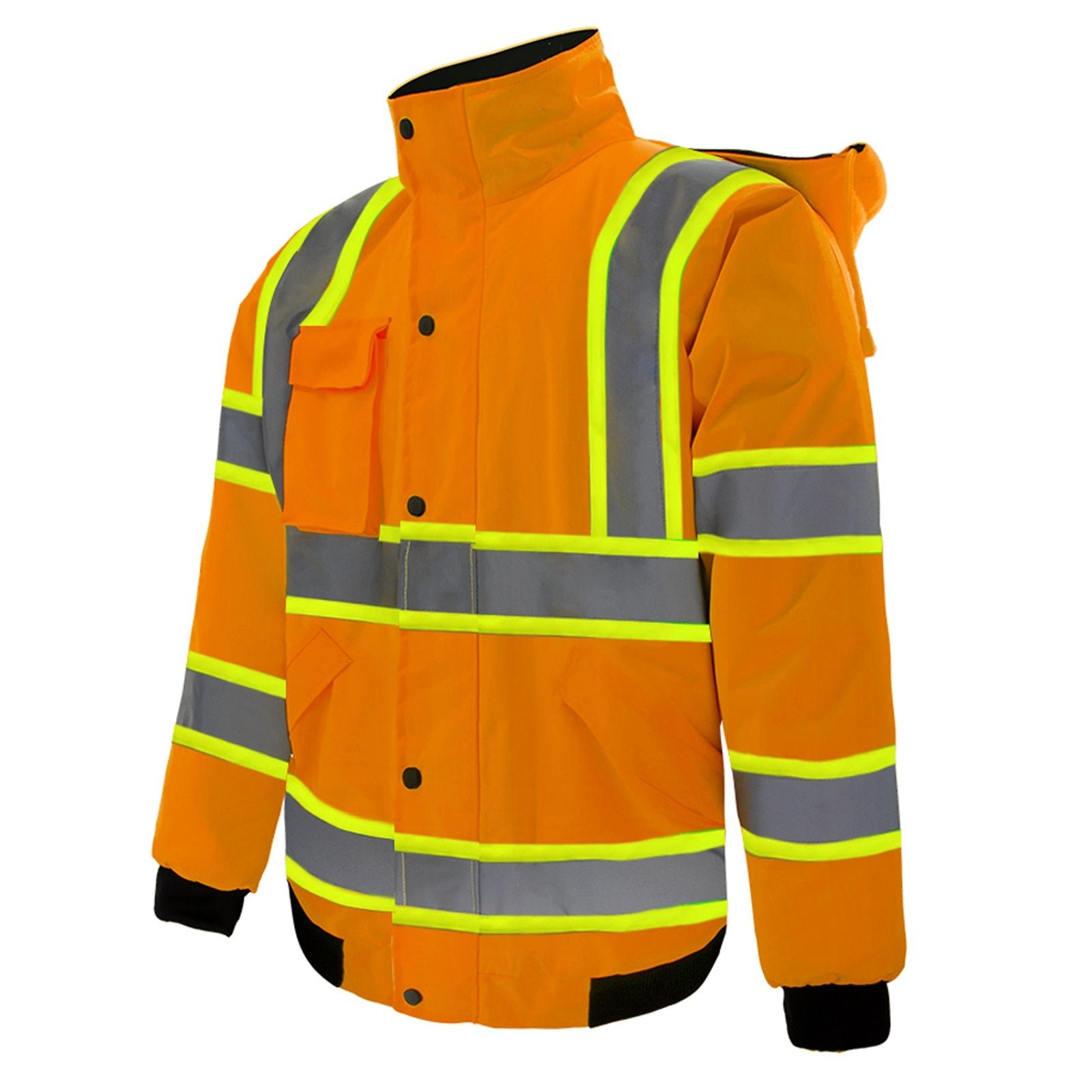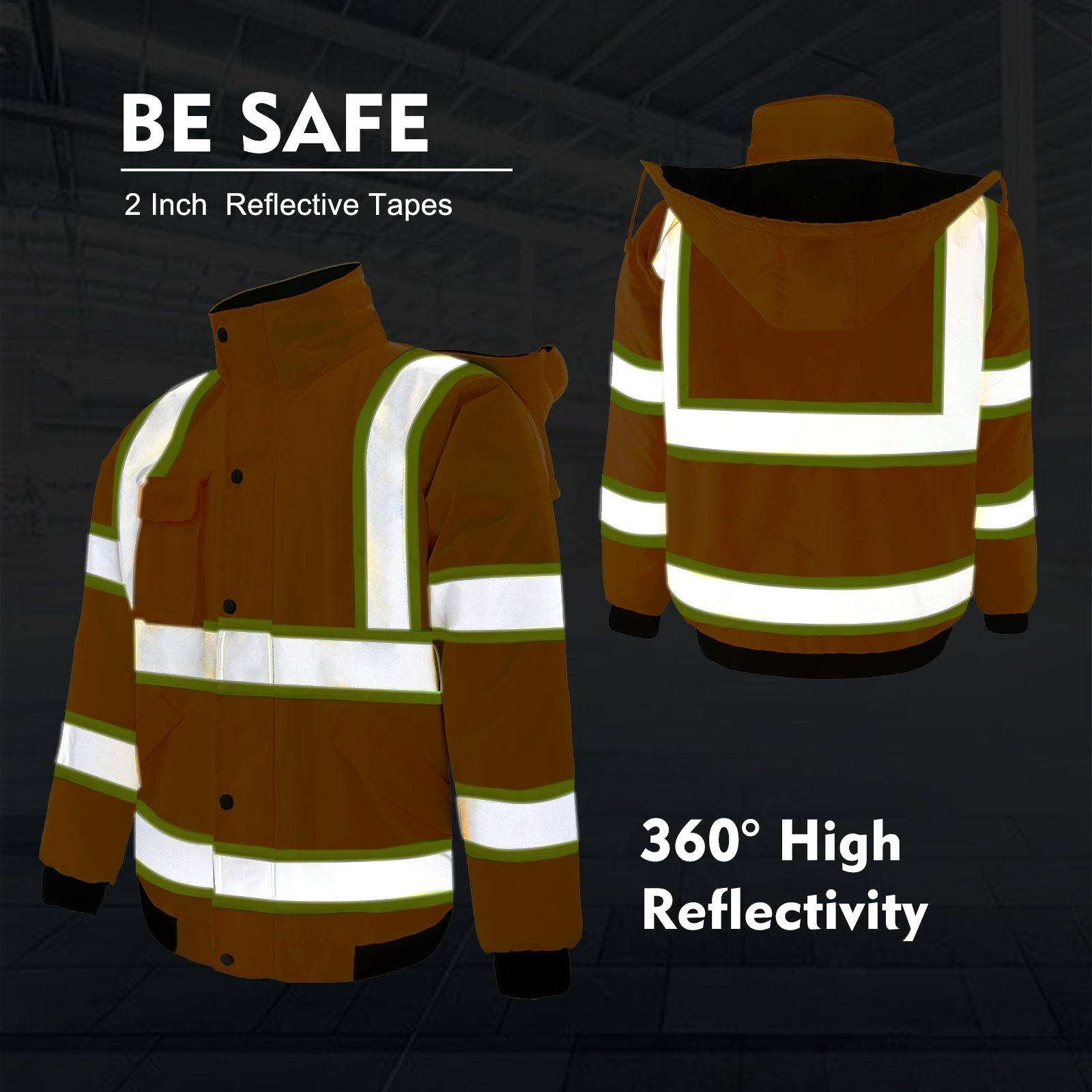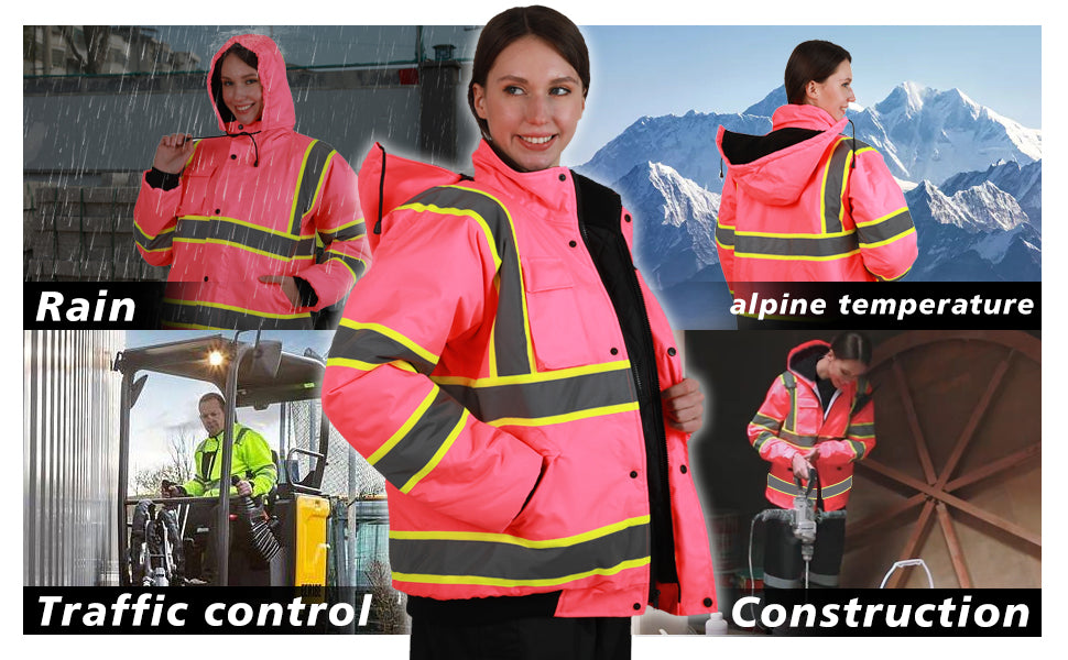 - 【MULTI-FUNCTION DESIGN】】Hi-Vis reflective safety jacket with 3 waterproof pockets, a flip pocket on the left chest that can hold a phone, and 2 large-capacity pockets with flip covers, which can store tools and items. Our safety jacket has a concealed front high-quality zipper closure, which is strong and smooth. Workwear with adjustable elastic ribbed cuffs and hem provides comfort at work. The jacket hood is also detachable and can be taken out when not needed.