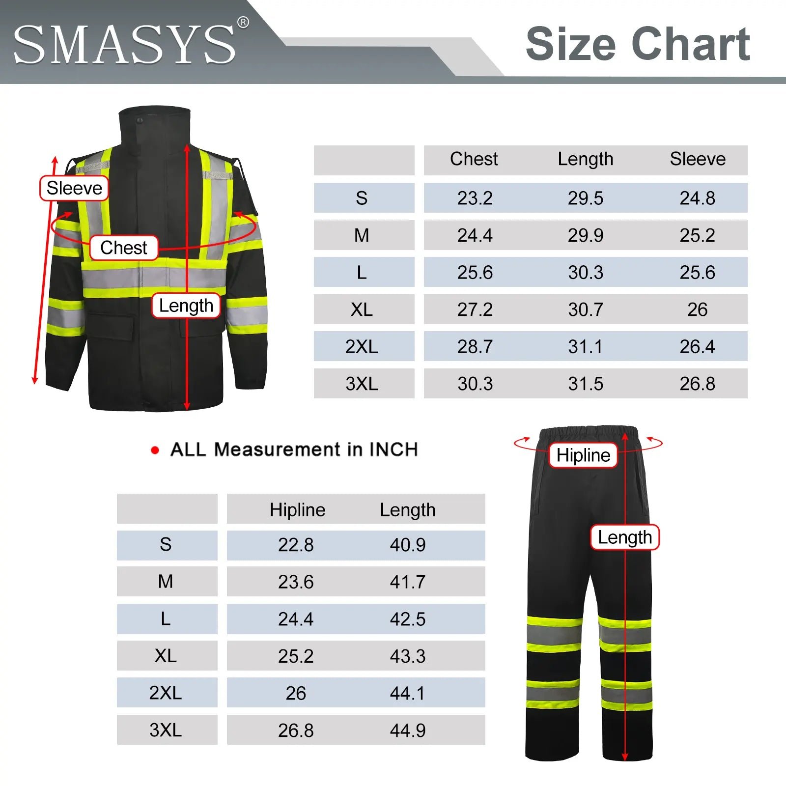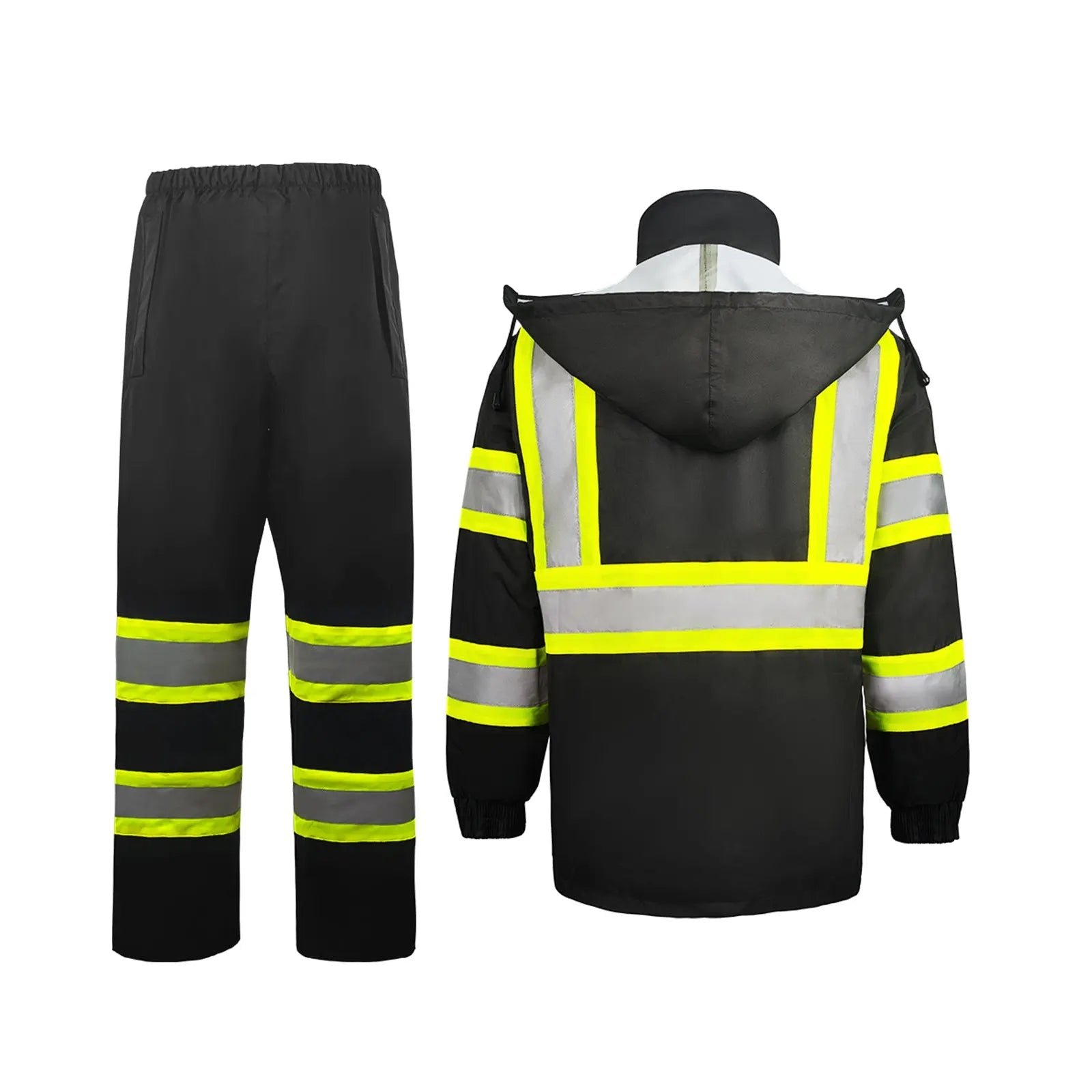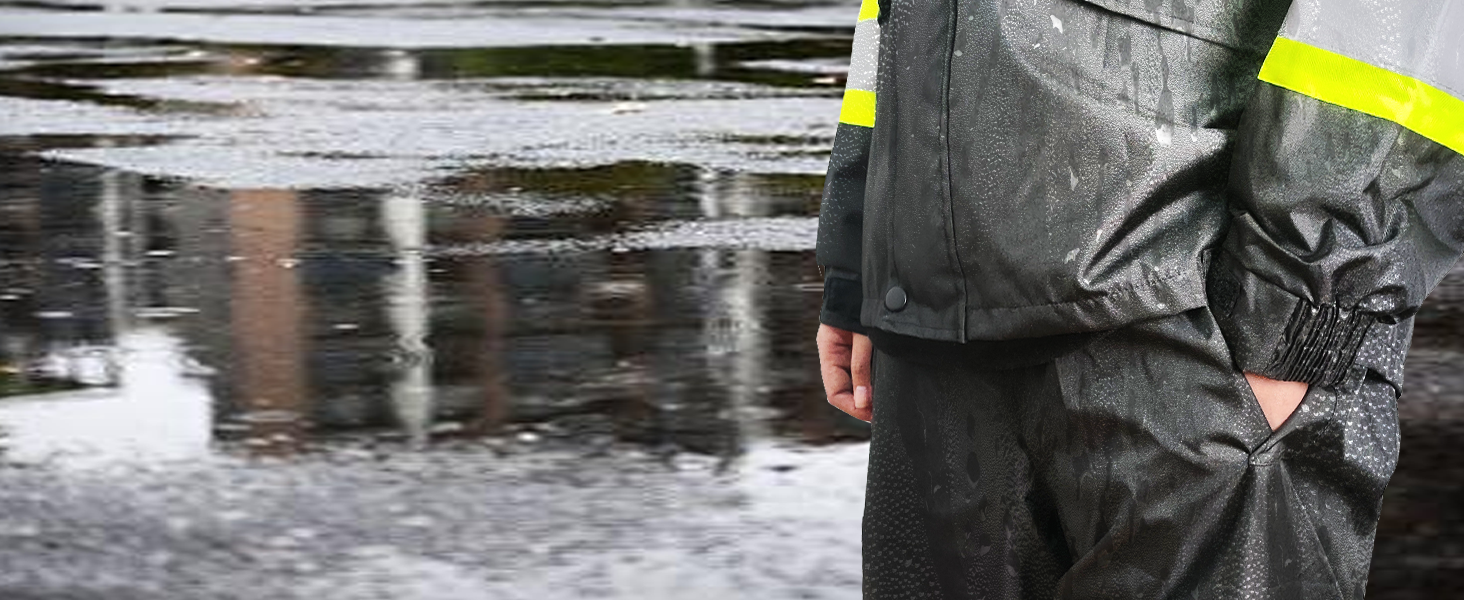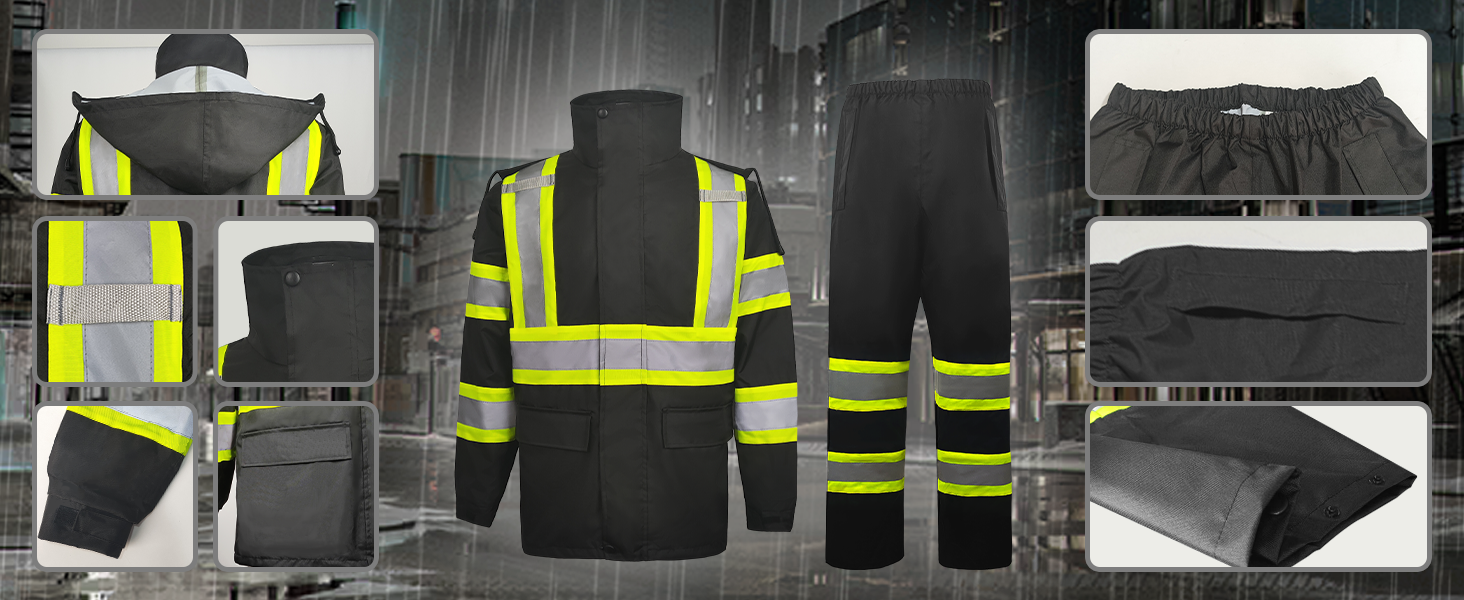 - 【HIGH VISIBILITY AND REFLECTIVITY】 The Safety Rain Jacket and Pants has 2 vertical and 1 horizontal 2-inche wide reflective strips with 3 inch contrast fabric to cover the waist, chest, shoulders, back respectively, and two 2-inch wide reflective stripes with 3 inch contrast fabric on each sleeve and additional 2 strips on each leg, which can provide 360° protection, improve the visibility of the jacket, make you stand out easily, and maximize the visibility and safety of the wearer.