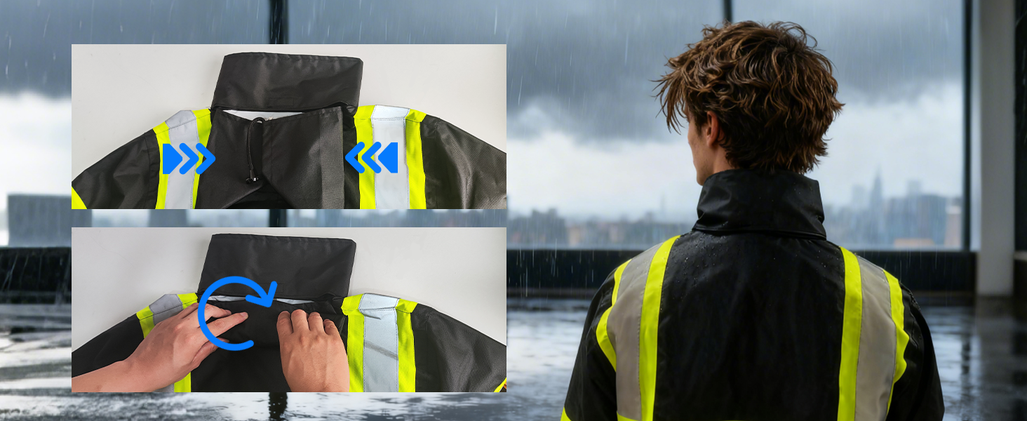 - 【DESIGN】 The HV waterproof raincoat is designed with a high-standing collar, a stackable hood in the collar and drawstrings. Additionally, it features two large, deep pockets with Velcro flaps at the hem, offering ample storage space. Our safety jacket has a concealed front high-quality zipper closure, which is strong and smooth, and 2 mic tabs on the shoulders for easy wearing of a walkie-talkie.