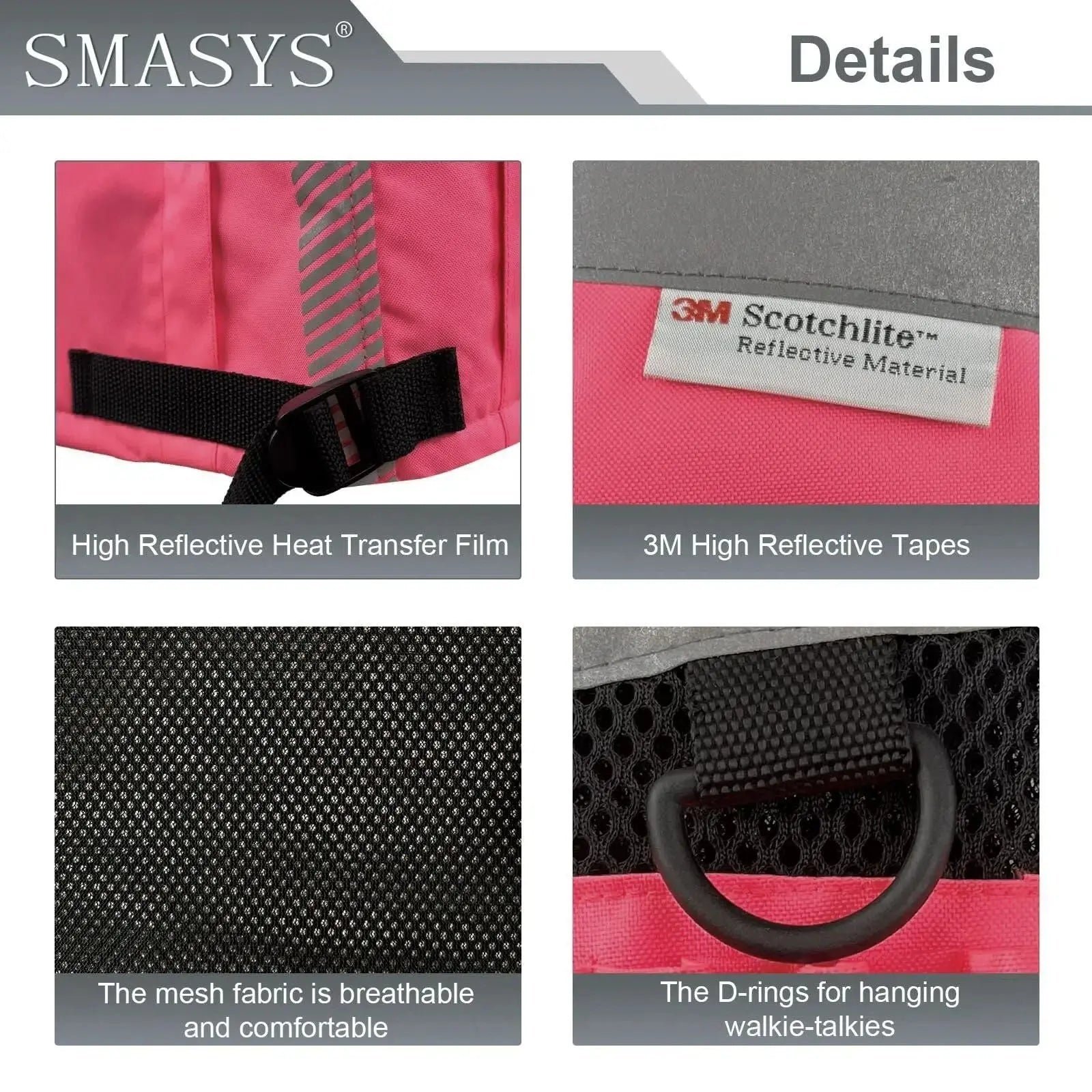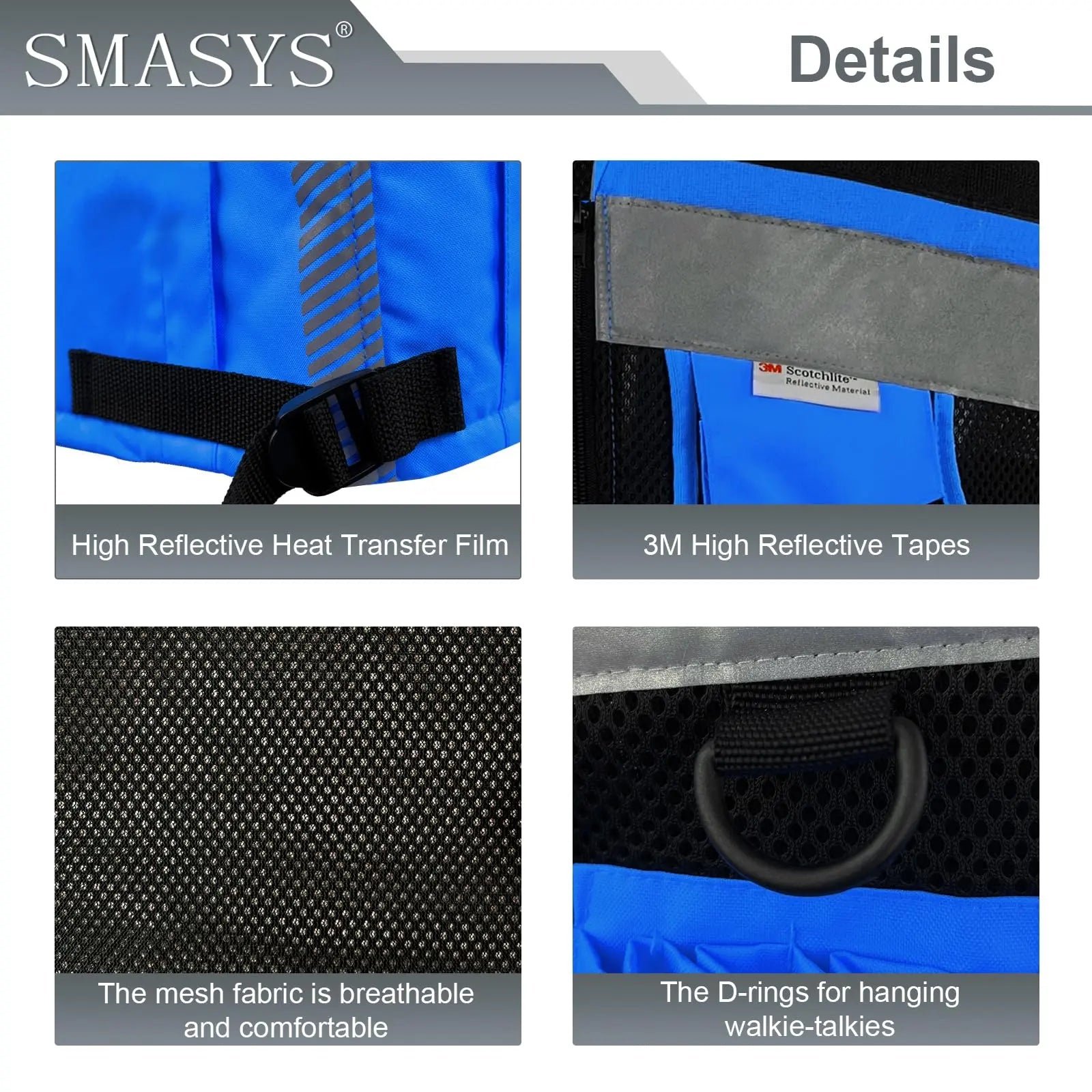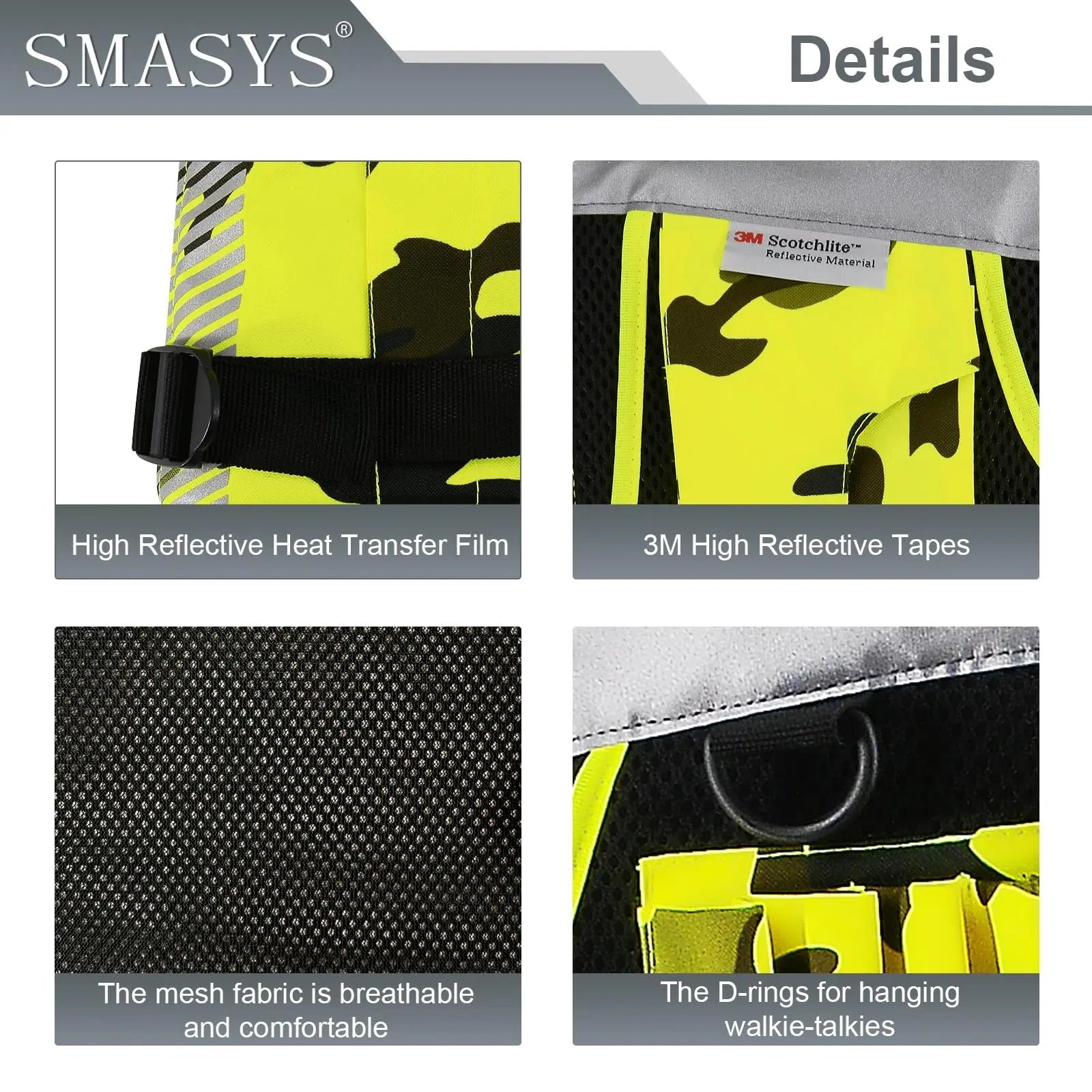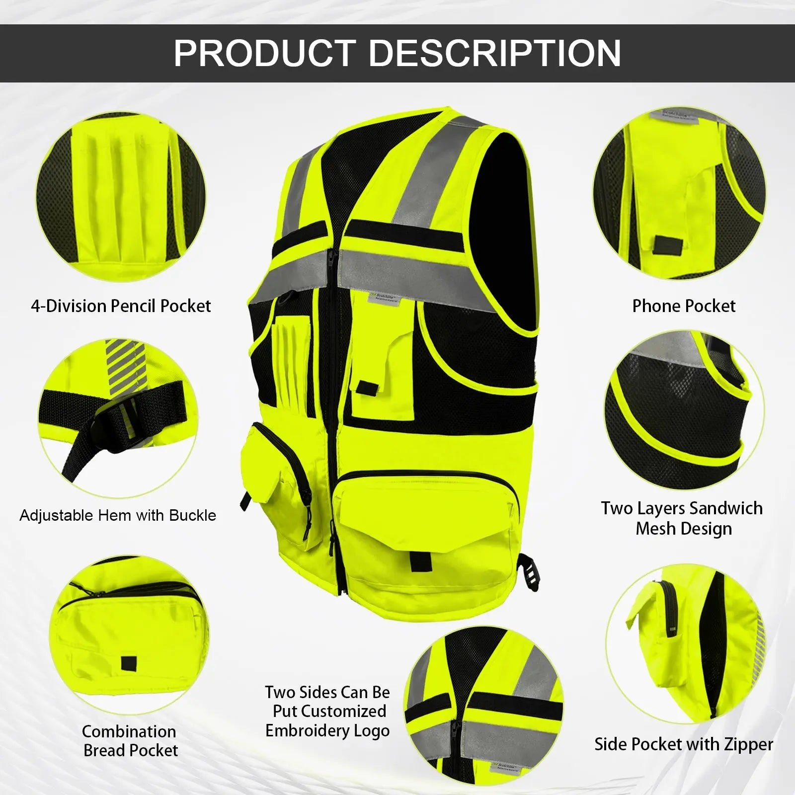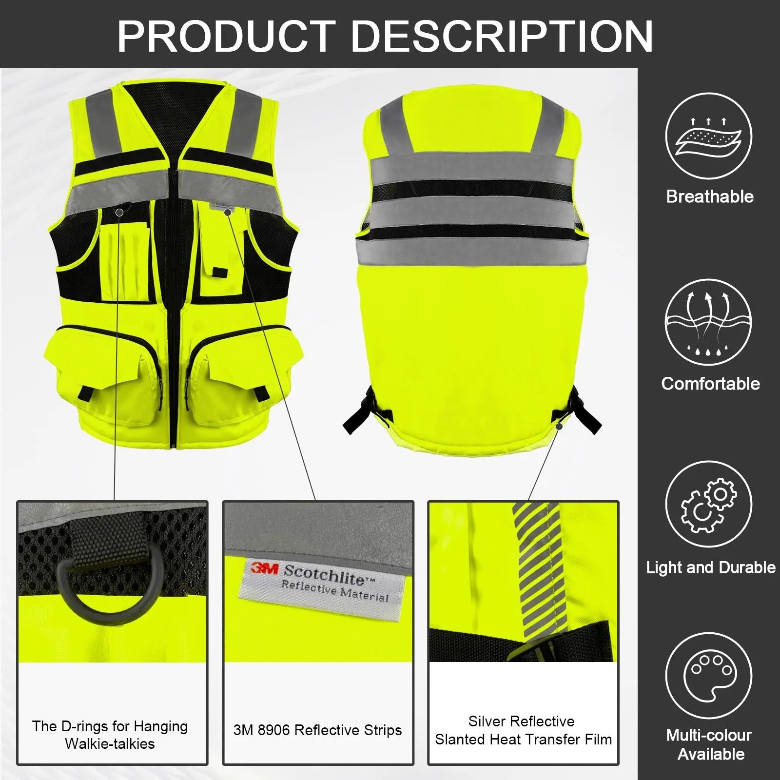 Made of 100% polyester fabric and Hi-Vis reflective material, compliant with ANSI/ISEA 107-2020 Class 2 standard. Durable, Breathable, Lightweight and Machine Washable