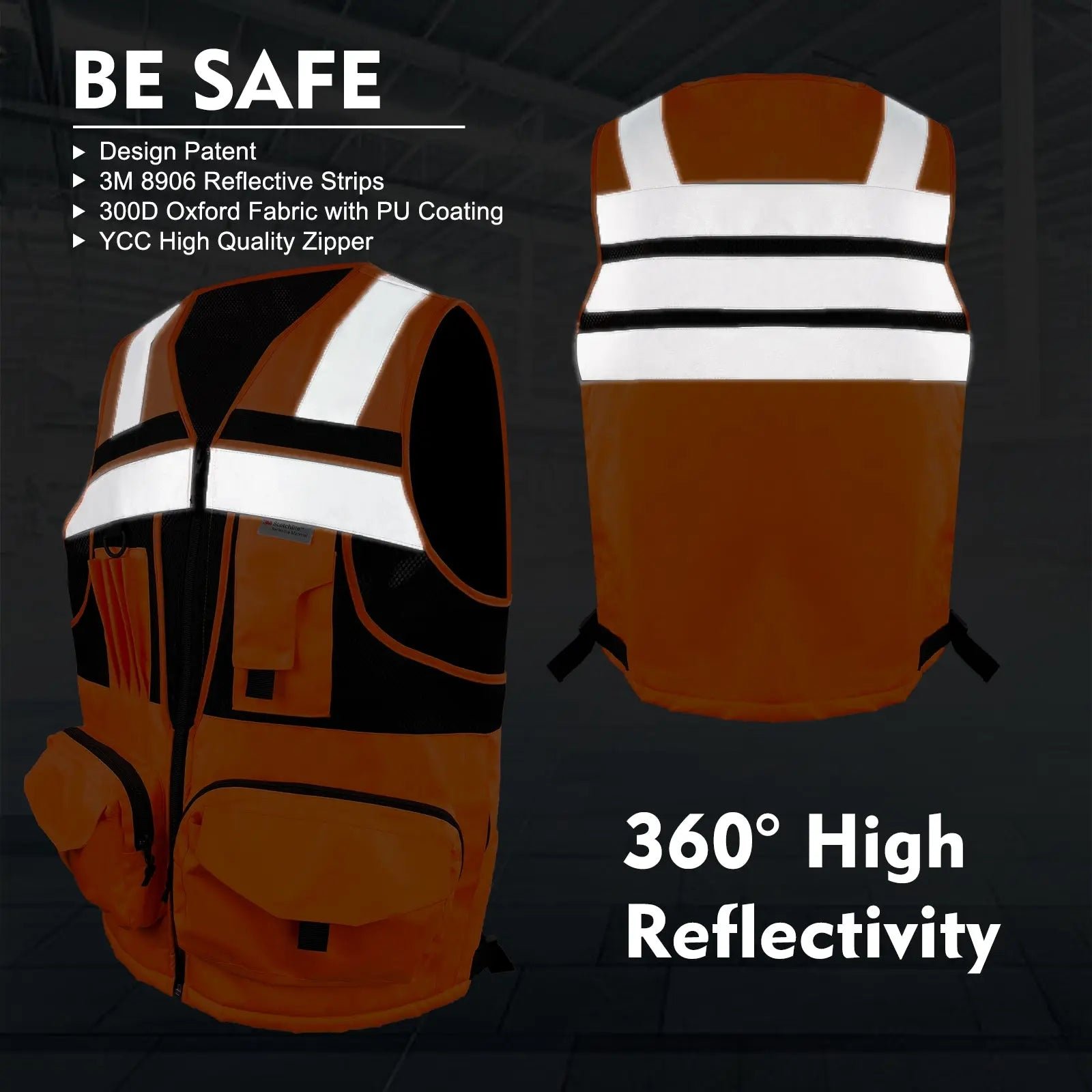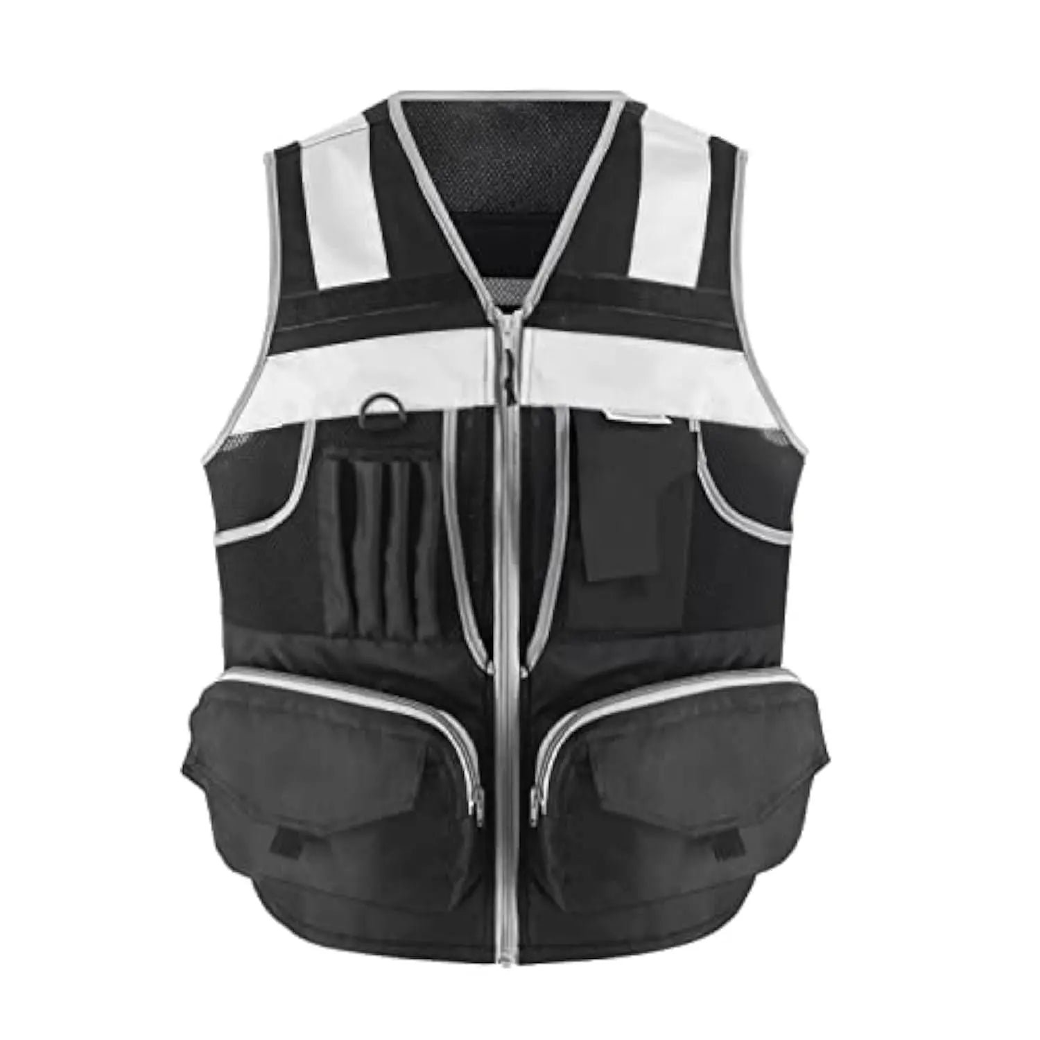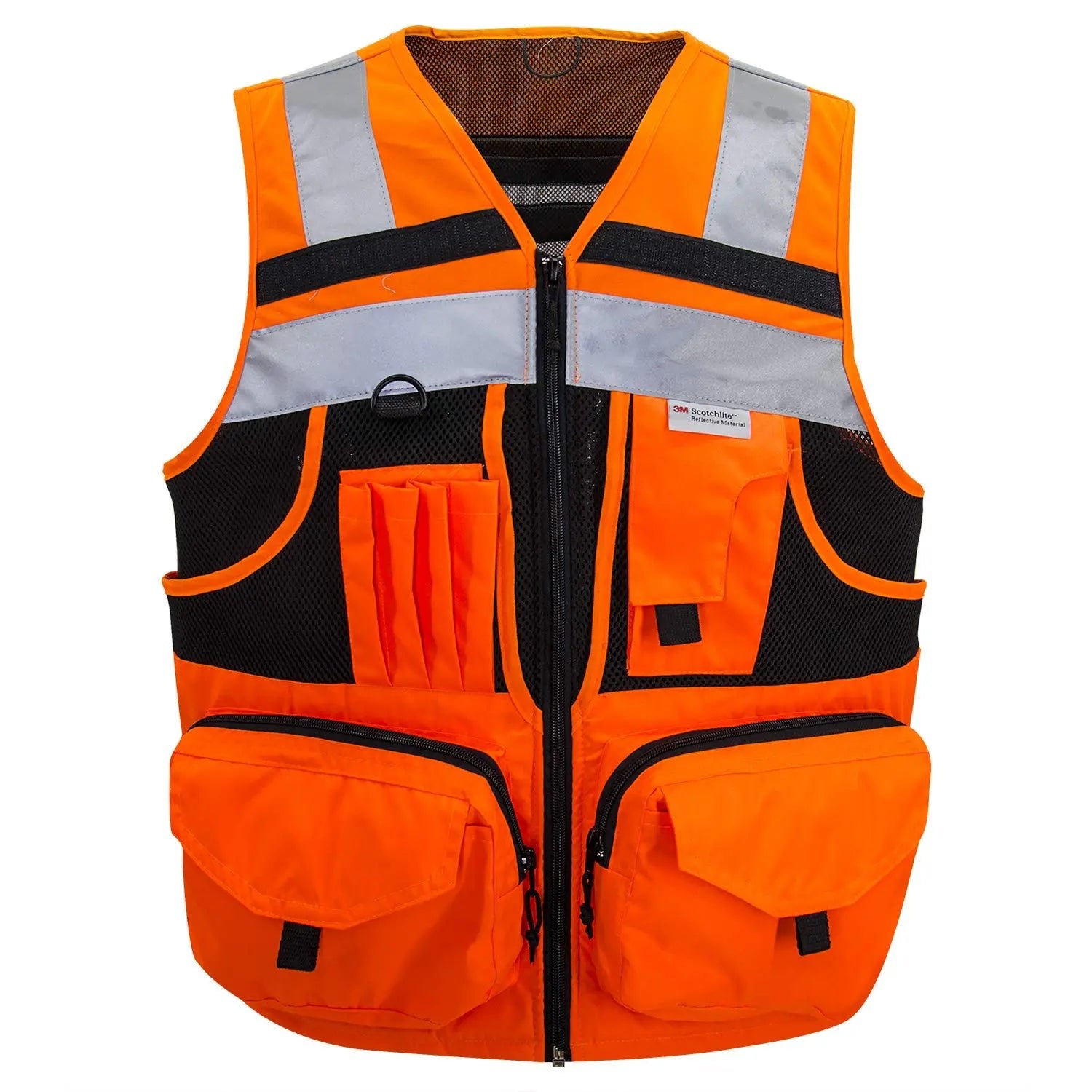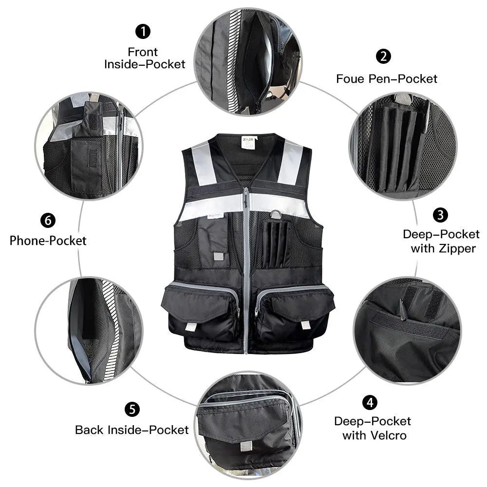 MATERIALS: Our heavy-duty vest is made of Oxford fabric,100% polyester knitting fabric, and sandwiched mesh, lightweight and breathable for the tough. A zipper is used for the doorway and two front pockets of the reflective vest; a nylon zipper is used for the rest. Each zipper has a sling. The black ribbon on the pocket is convenient for opening the pocket. The pockets on both sides also have hooks and loops to prevent goods from falling. D-rings for easy hanging of walkie-talkies and work cards.