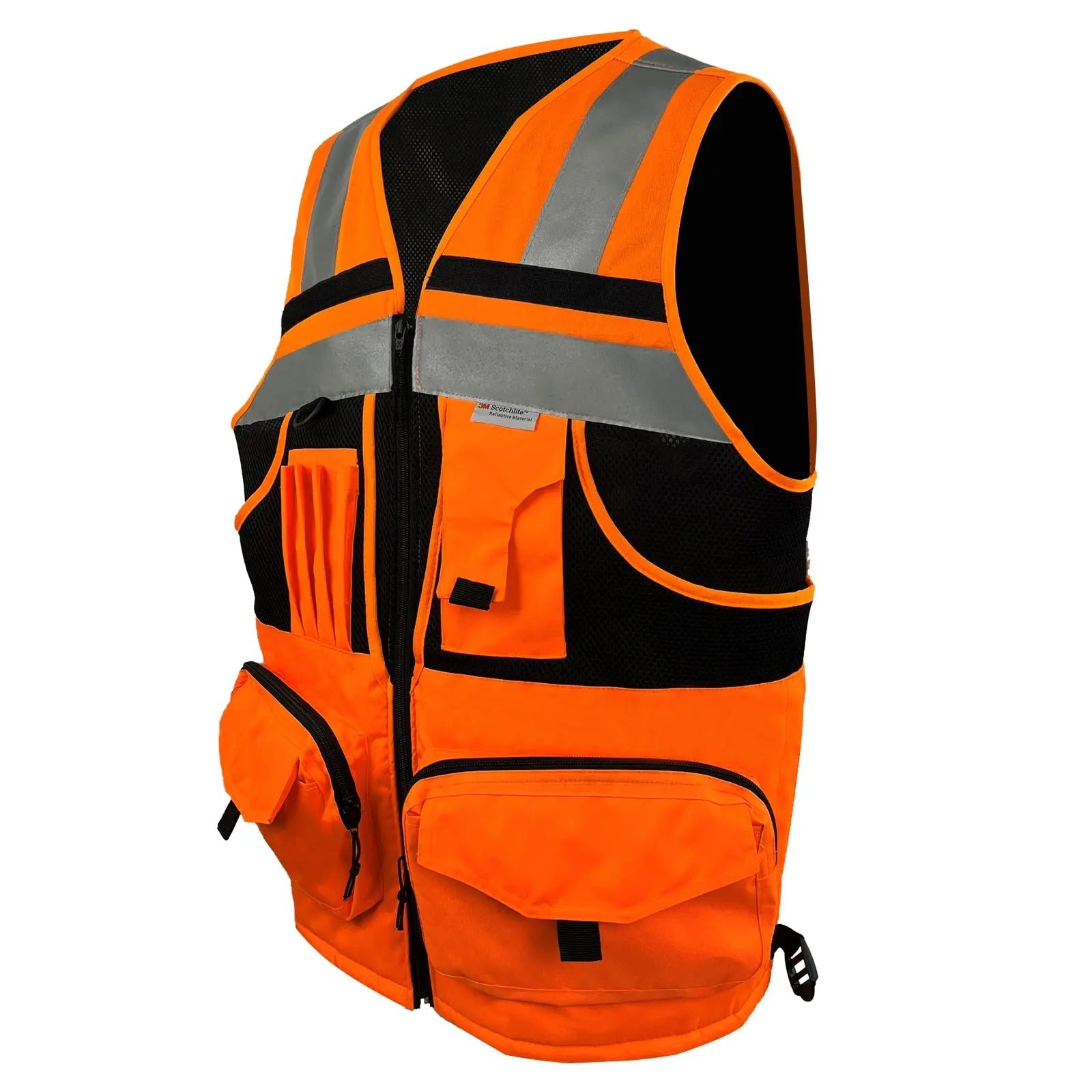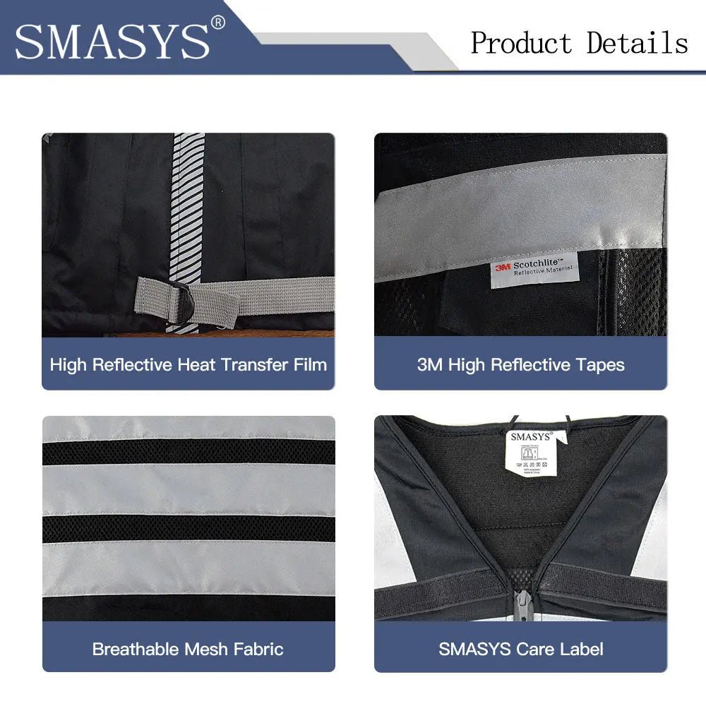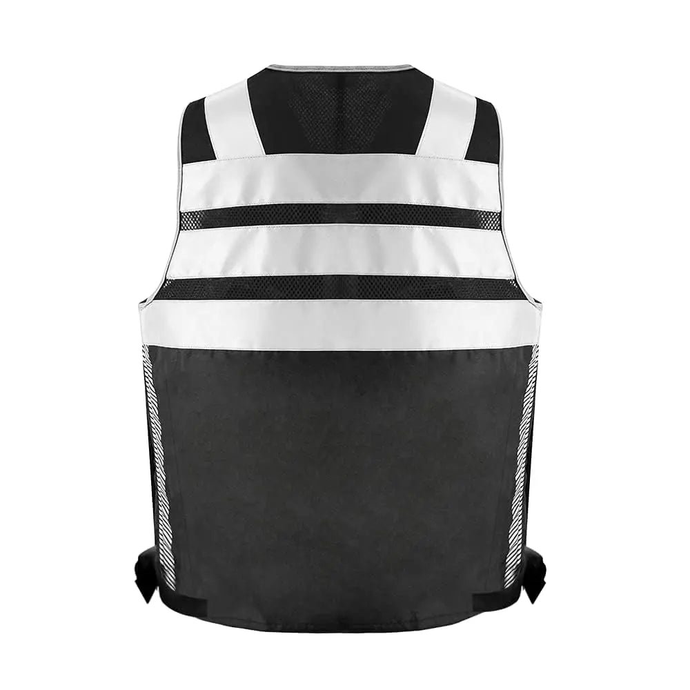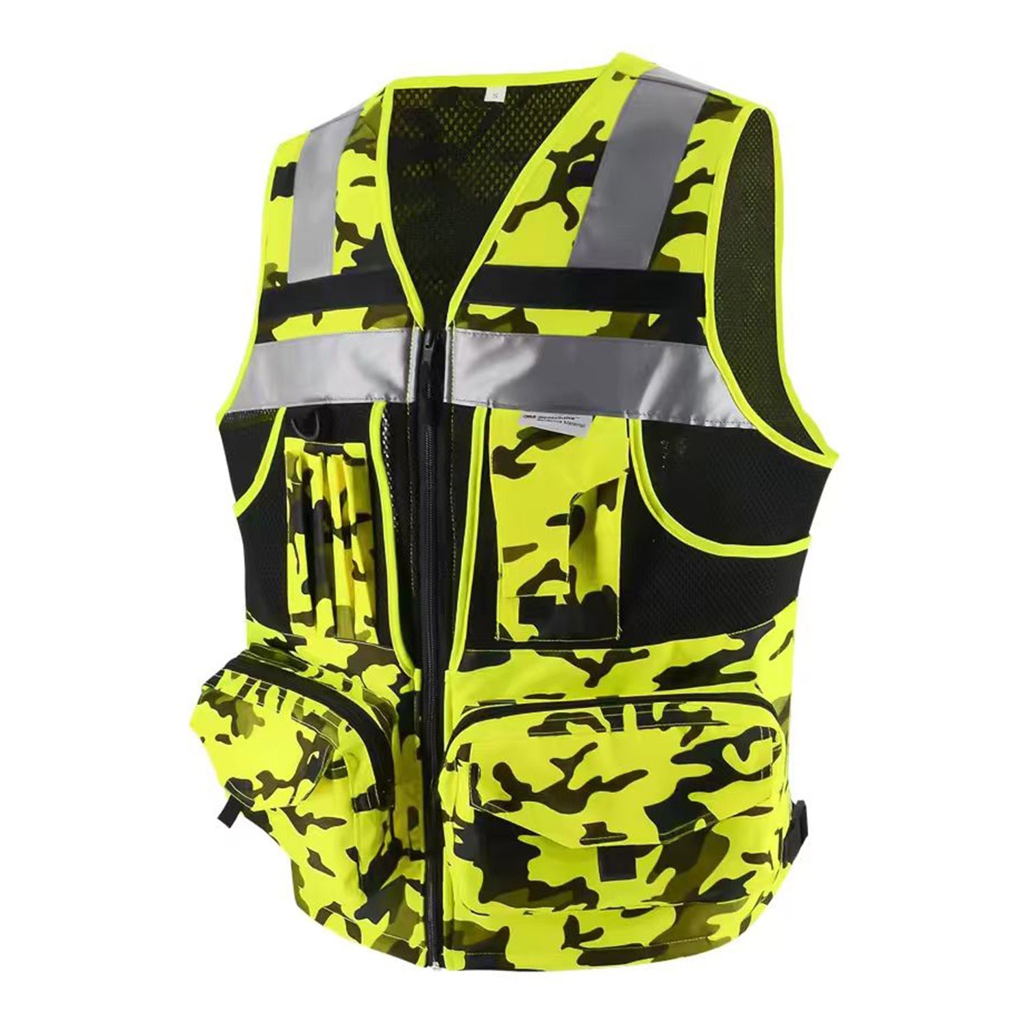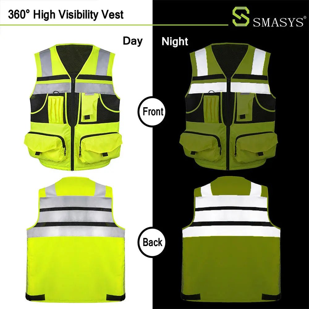 MATERIALS: Our heavy-duty vest is made of Oxford fabric,100% polyester knitting fabric, and sandwiched mesh, lightweight and breathable for the tough. A zipper is used for the doorway and two front pockets of the reflective vest; a nylon zipper is used for the rest. Each zipper has a sling. The black ribbon on the pocket is convenient for opening the pocket. The pockets on both sides also have hooks and loops to prevent goods from falling. D-rings for easy hanging of walkie-talkies and work cards.