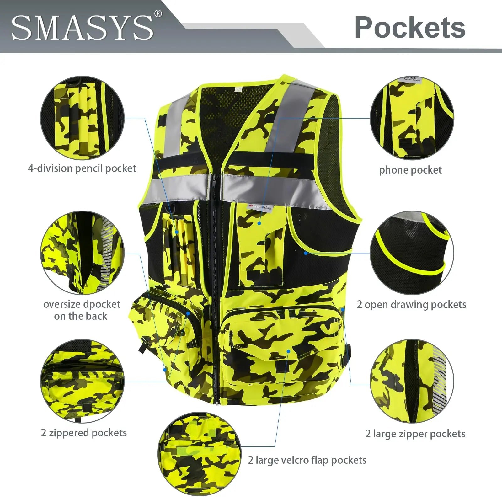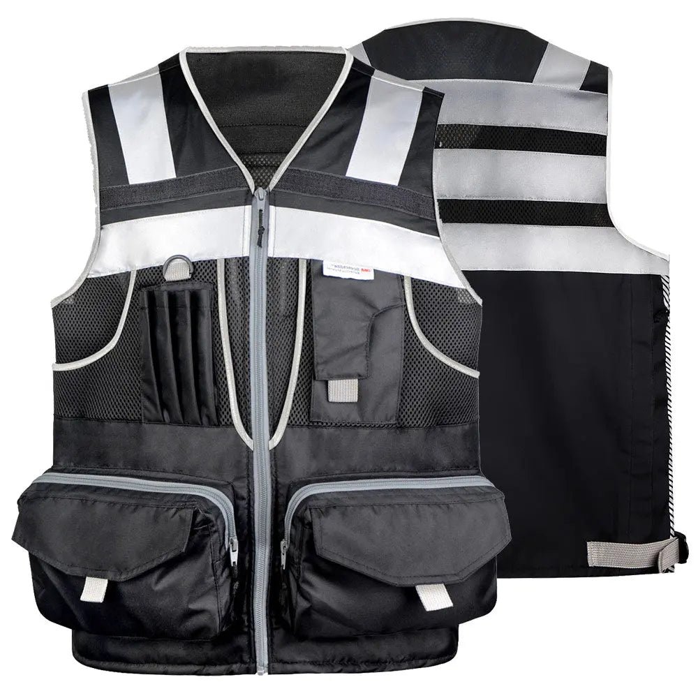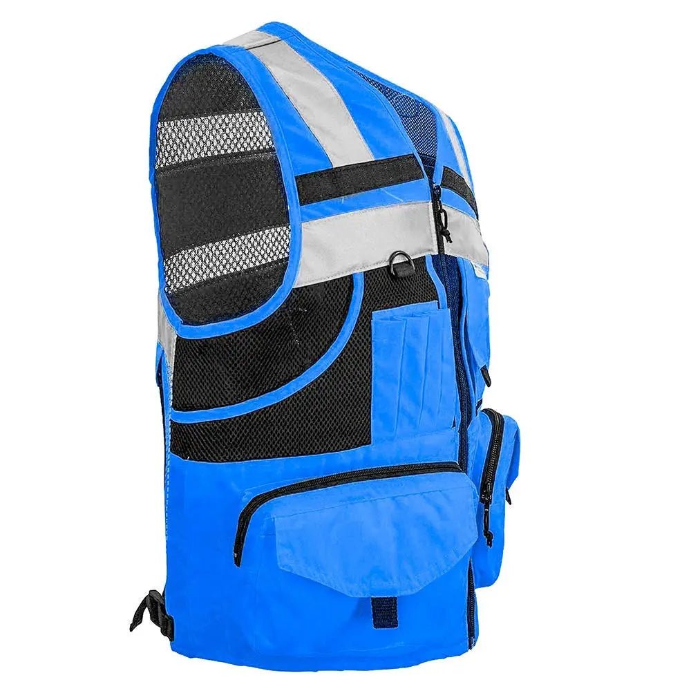 MULTI POCKETS: The safety vest features 10 pockets, including 8 on the front and 2 on the sides, for easy access. In addition to the two top pockets for pens and a 5 x 3-inch phone, the 8 remaining pockets are organized 4 to a side in conventional bilateral symmetry. What sets them apart is their holding capacities and unusually effective layering system with 4 layers of pockets on each side.
