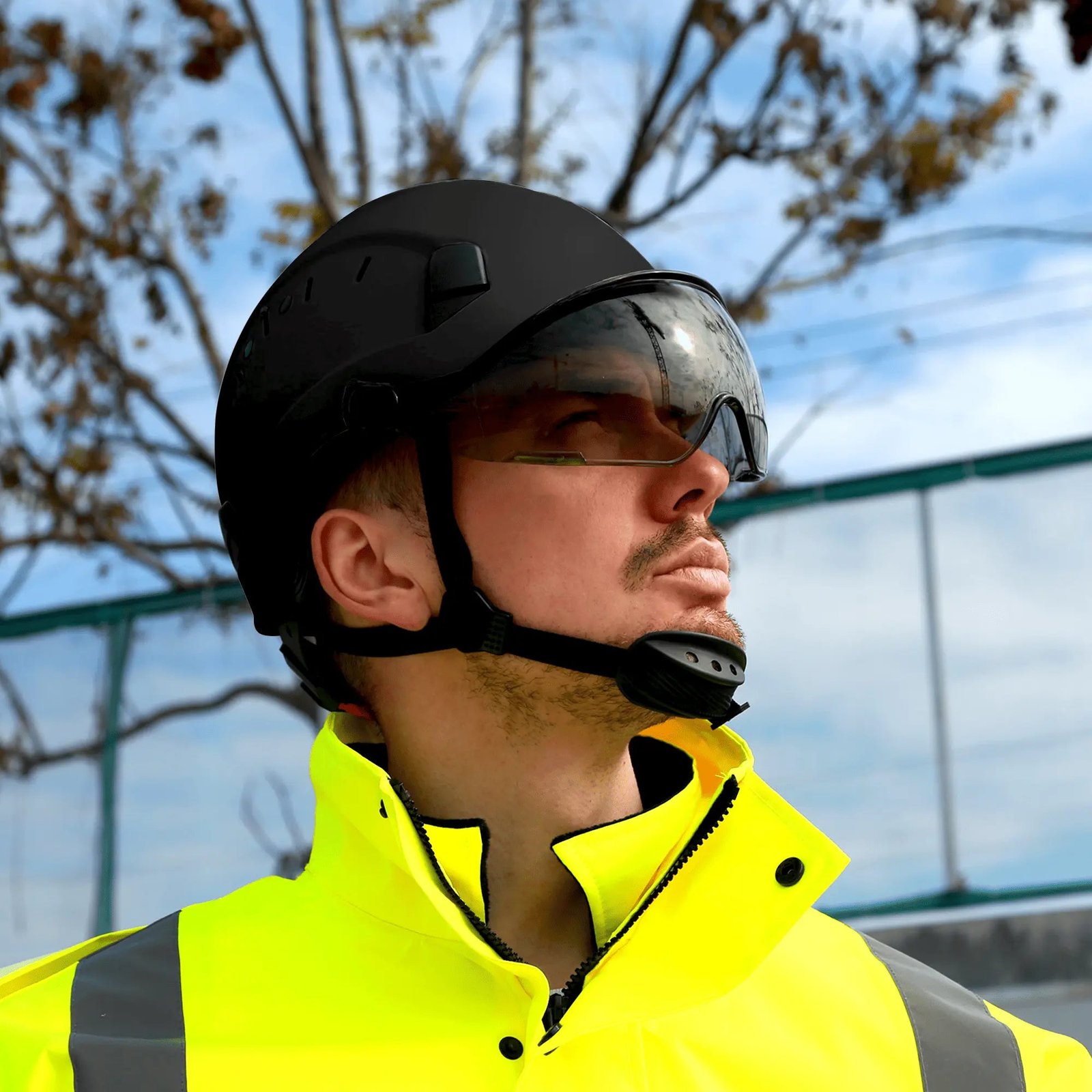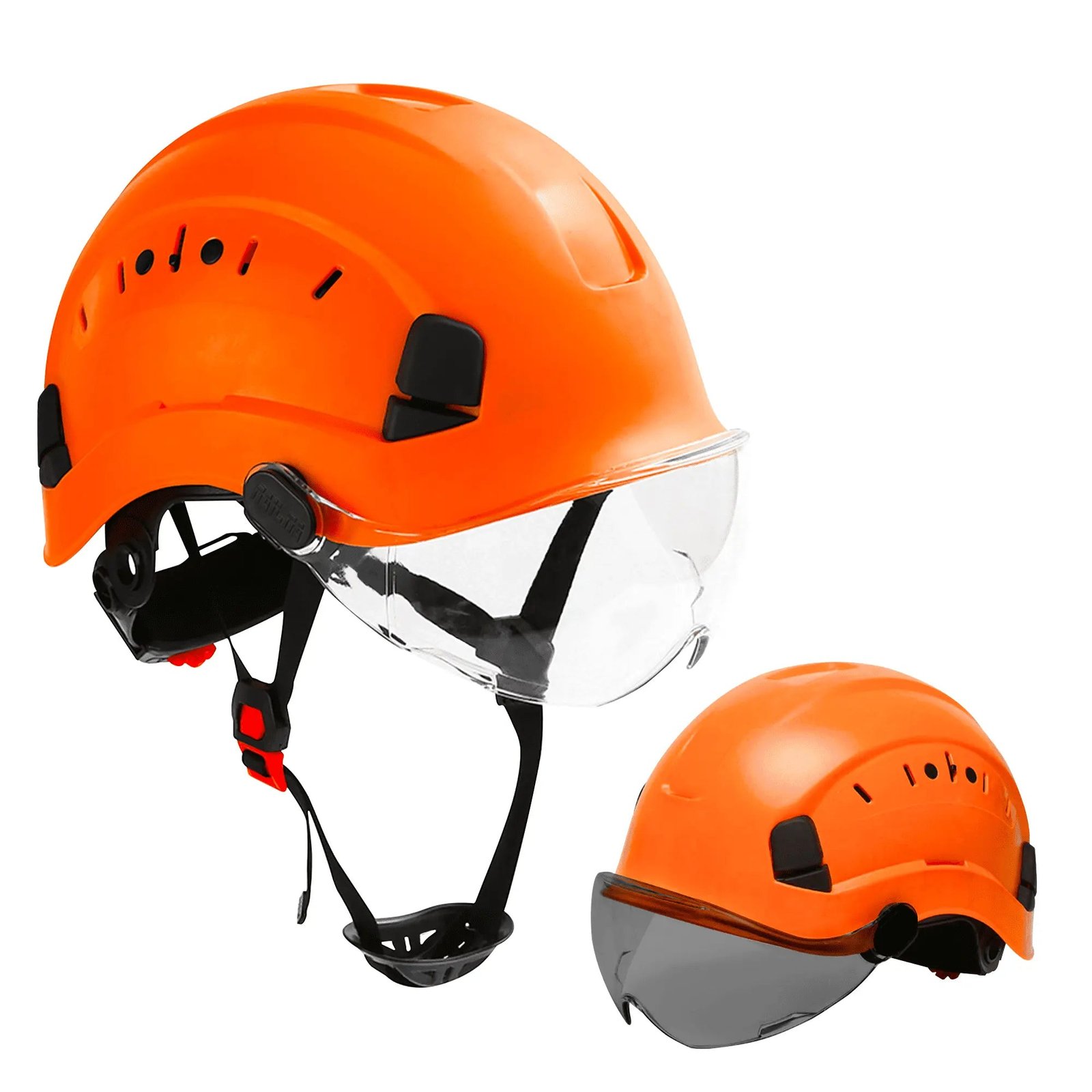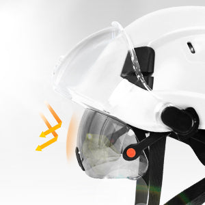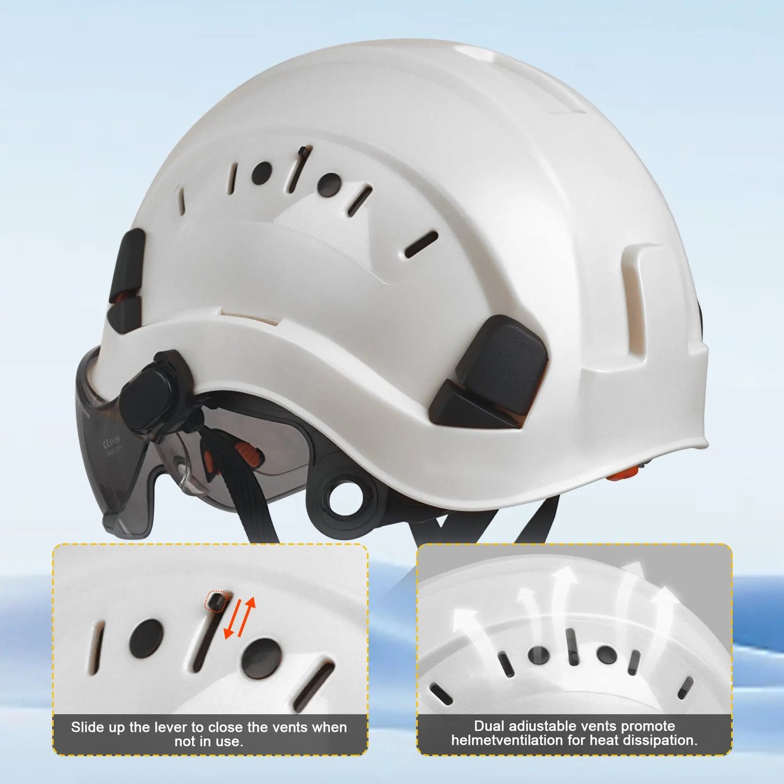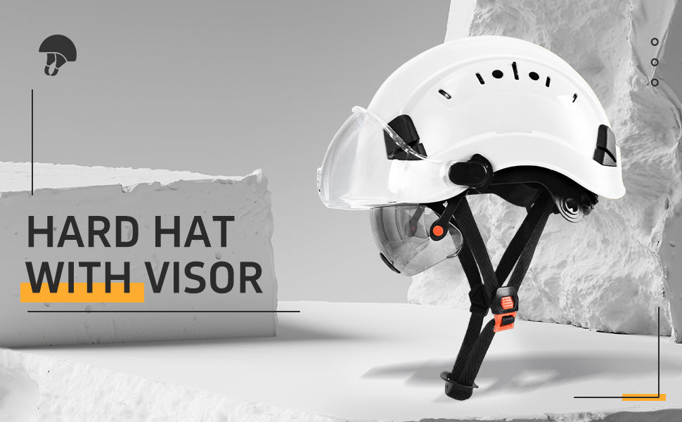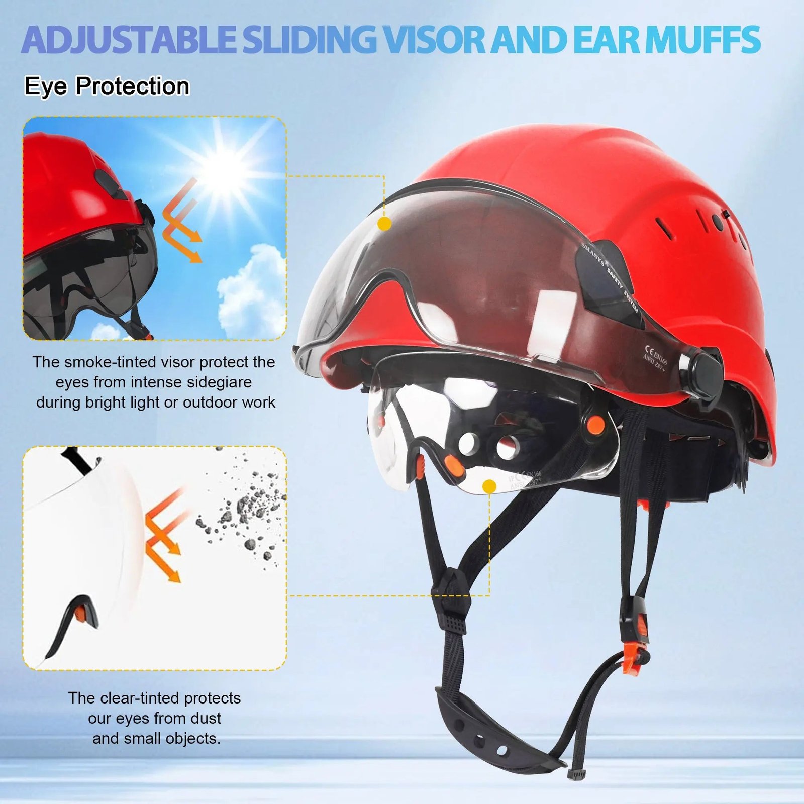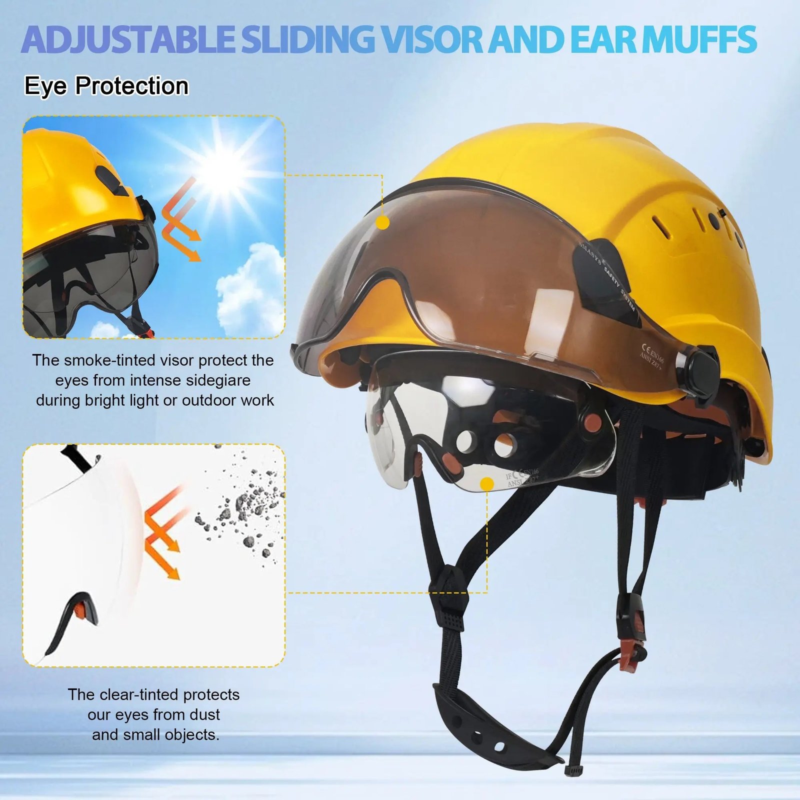 - 【CONFIDENCE IN PROTECTION】 Safety helmets protect the head from falling objects on construction sites or building sites, ensuring the safety of the wearer’s life. The visor can be slid up and down. When in use, slide it down to protect your eyes from scratches and dust, ensuring clear and unobstructed vision even when wearing sunglasses or reading glasses underneath. When the visor is not in use, it can be slid to the top of the helmet.