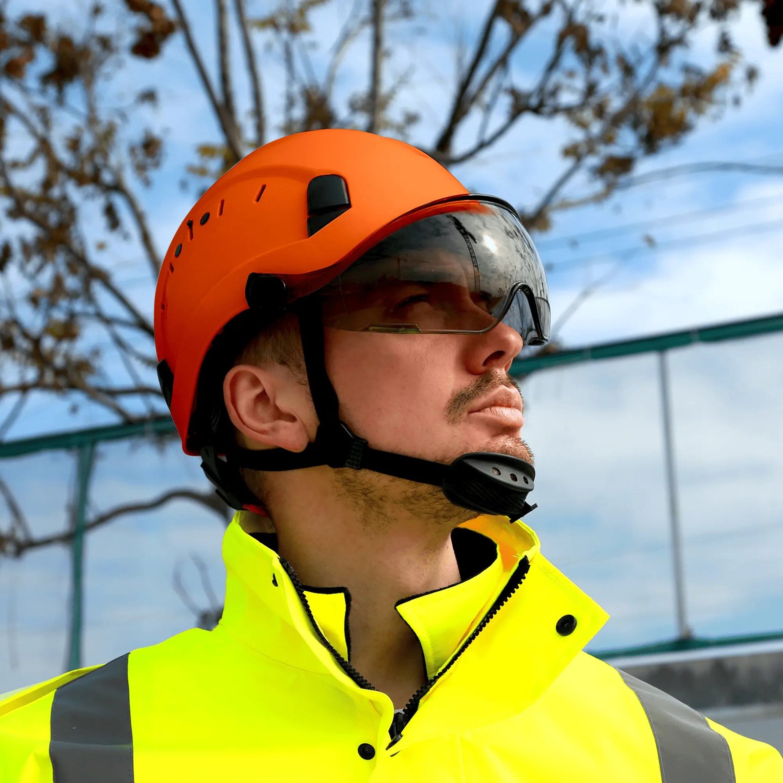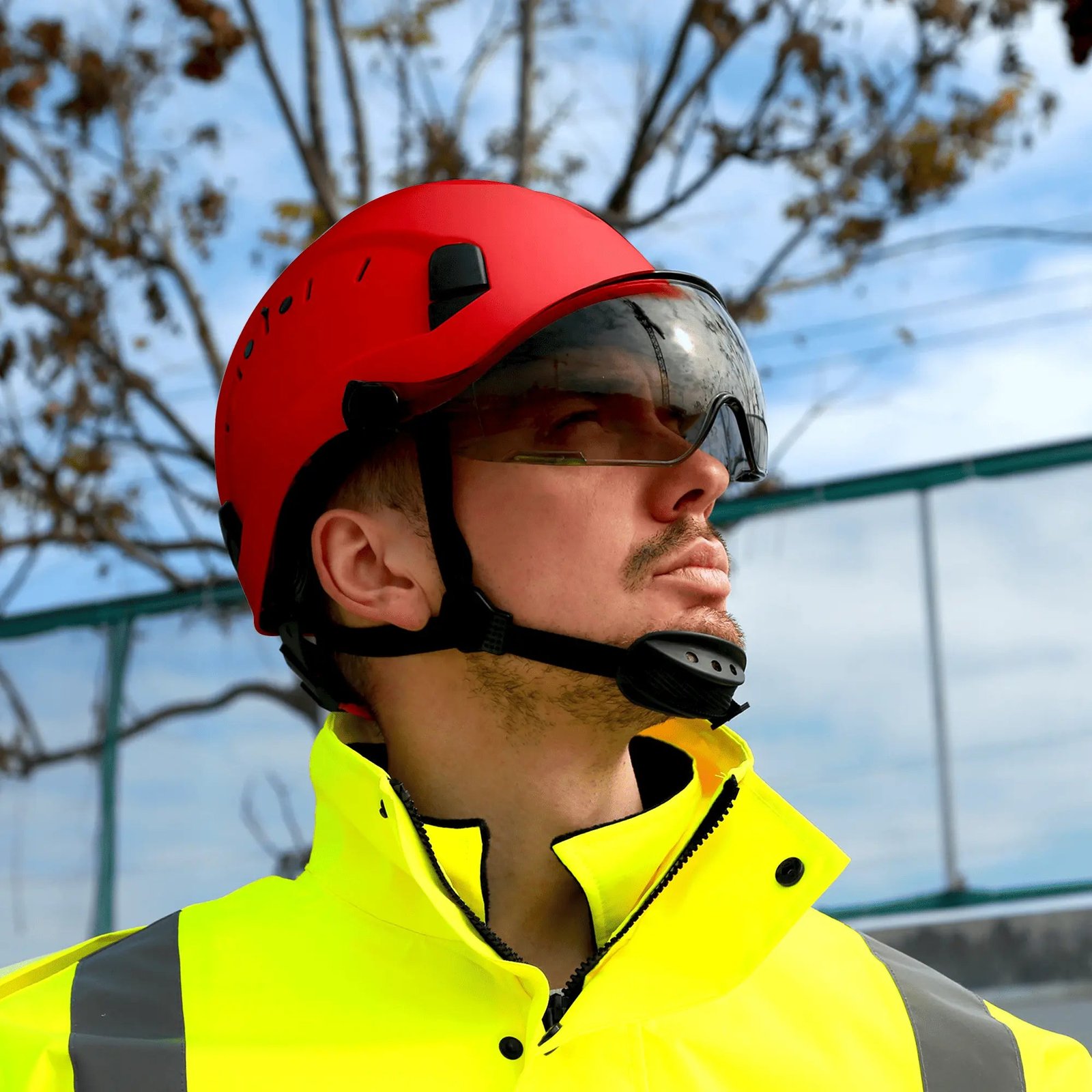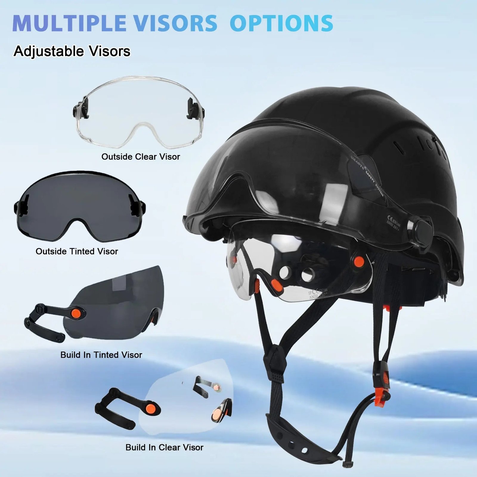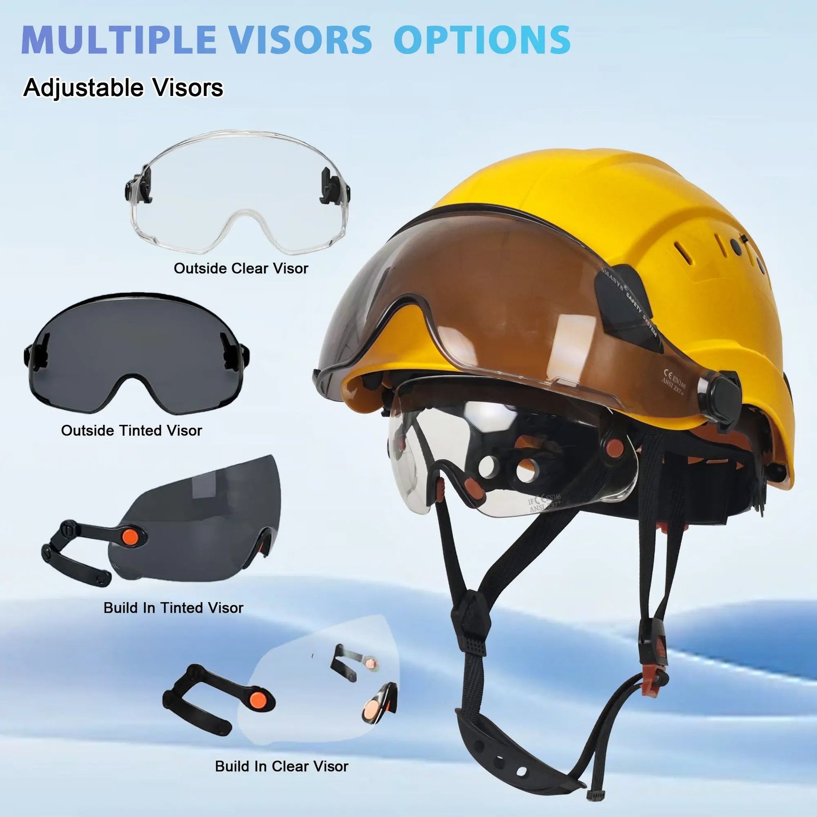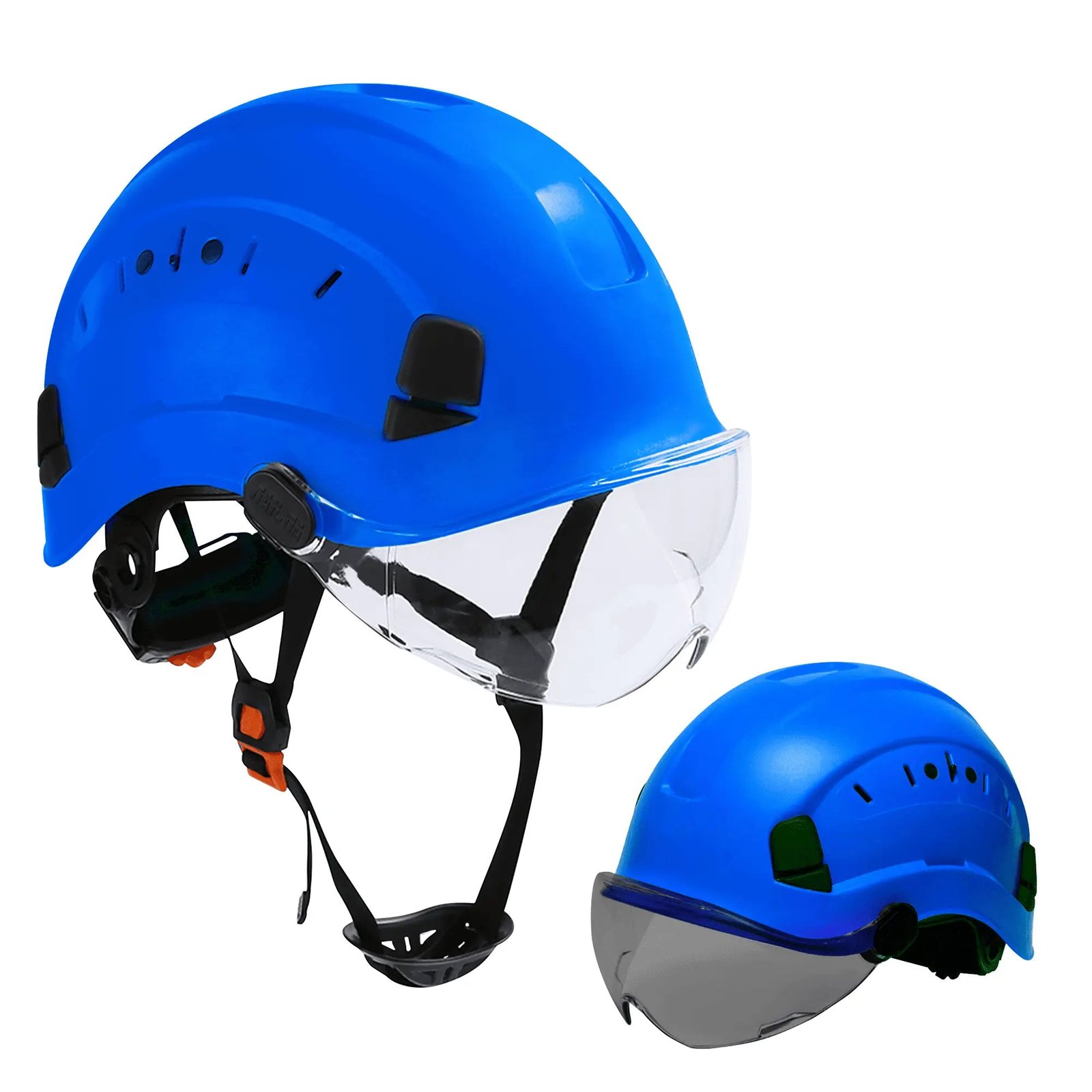 - 【CONFIDENCE IN PROTECTION】 Safety helmets protect the head from falling objects on construction sites or building sites, ensuring the safety of the wearer’s life. The visor can be slid up and down. When in use, slide it down to protect your eyes from scratches and dust, ensuring clear and unobstructed vision even when wearing sunglasses or reading glasses underneath. When the visor is not in use, it can be slid to the top of the helmet.