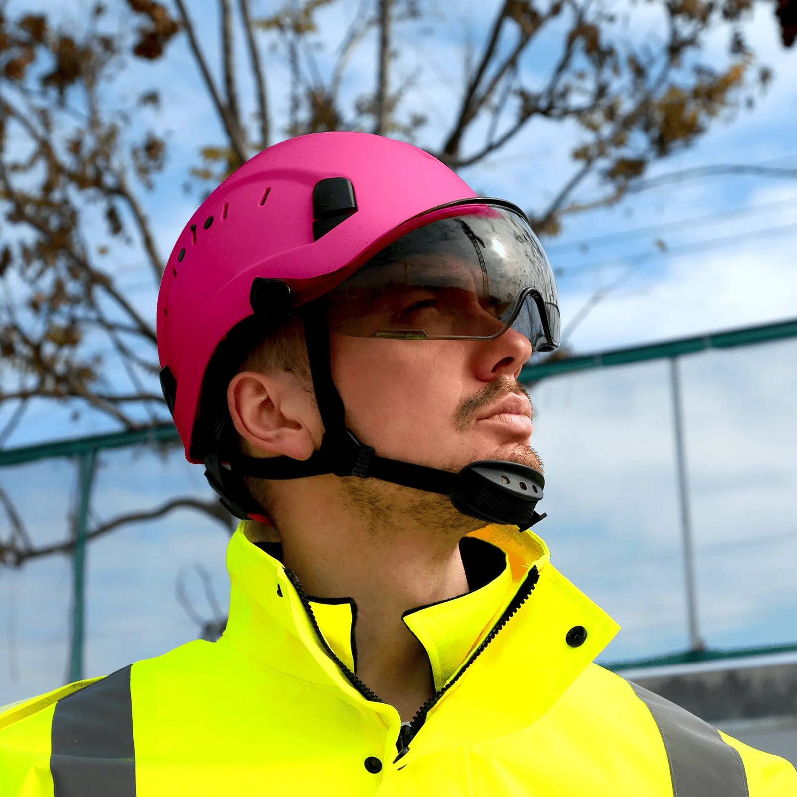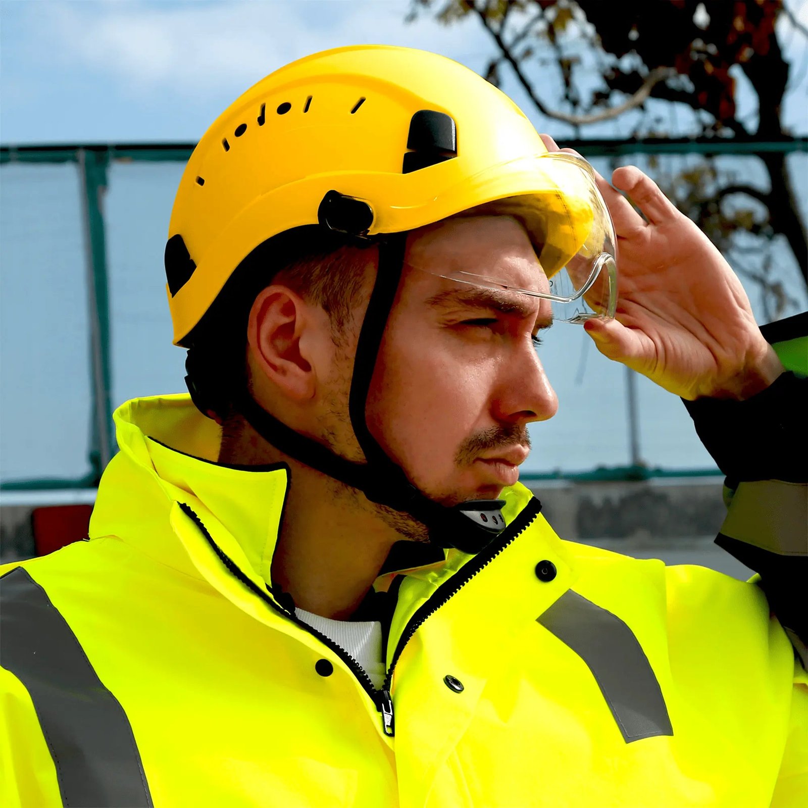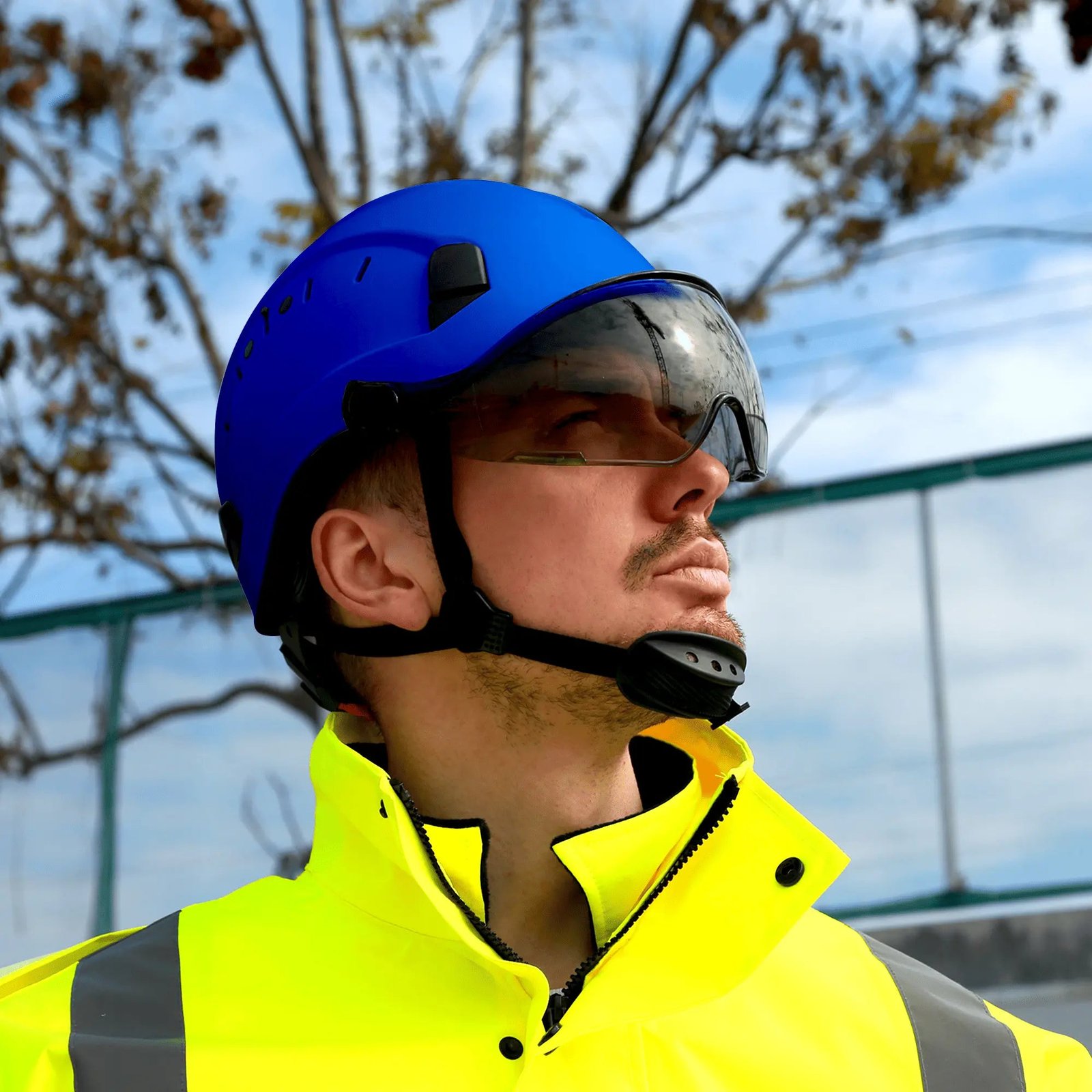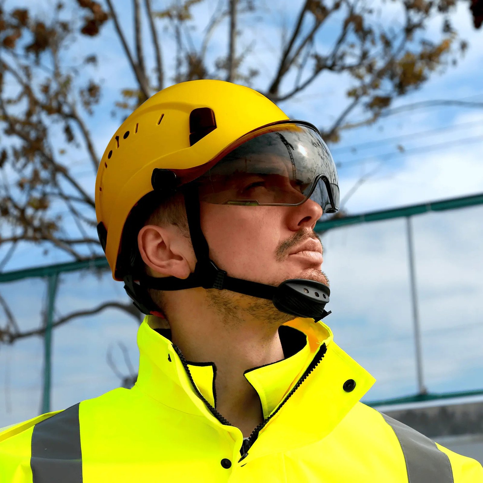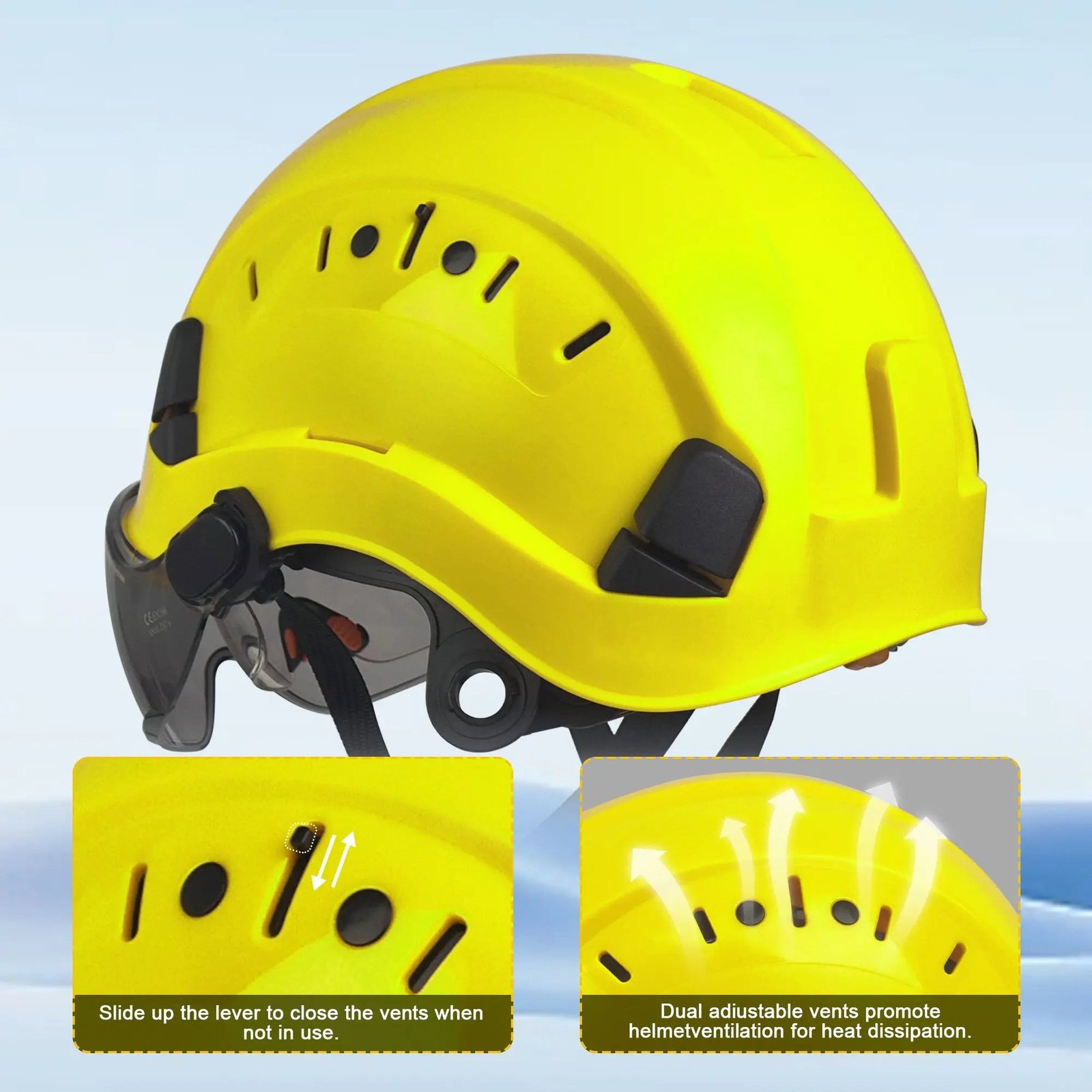 - 【CONFIDENCE IN PROTECTION】 Safety helmets protect the head from falling objects on construction sites or building sites, ensuring the safety of the wearer’s life. The visor can be slid up and down. When in use, slide it down to protect your eyes from scratches and dust, ensuring clear and unobstructed vision even when wearing sunglasses or reading glasses underneath. When the visor is not in use, it can be slid to the top of the helmet.