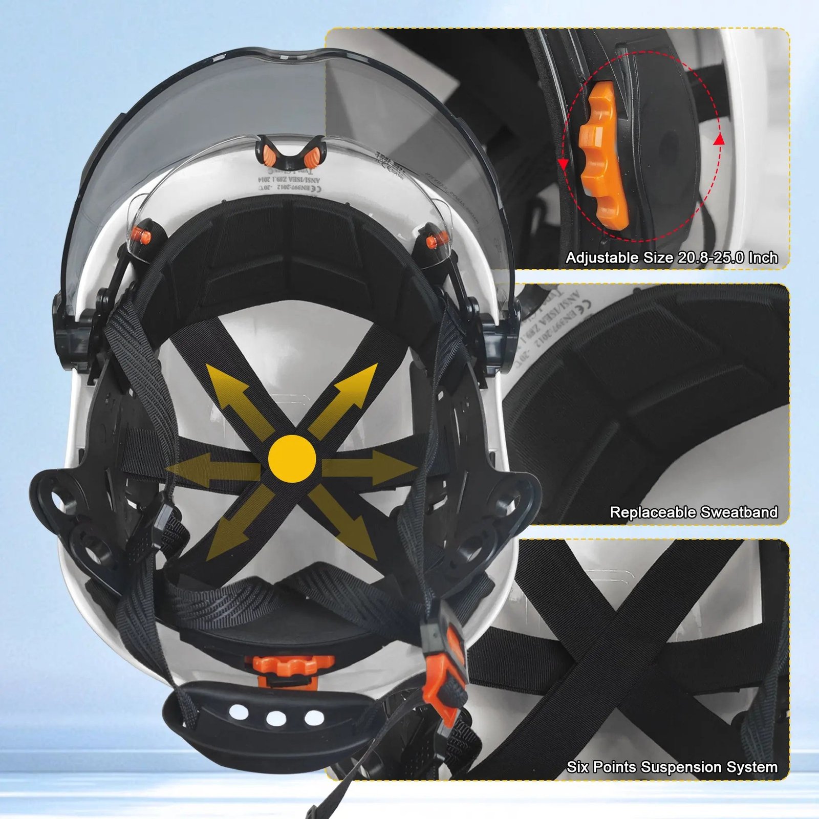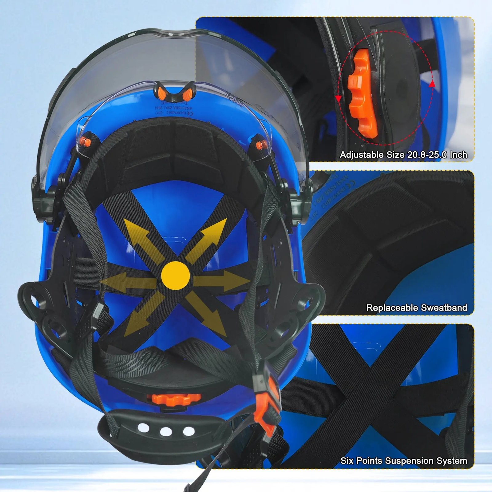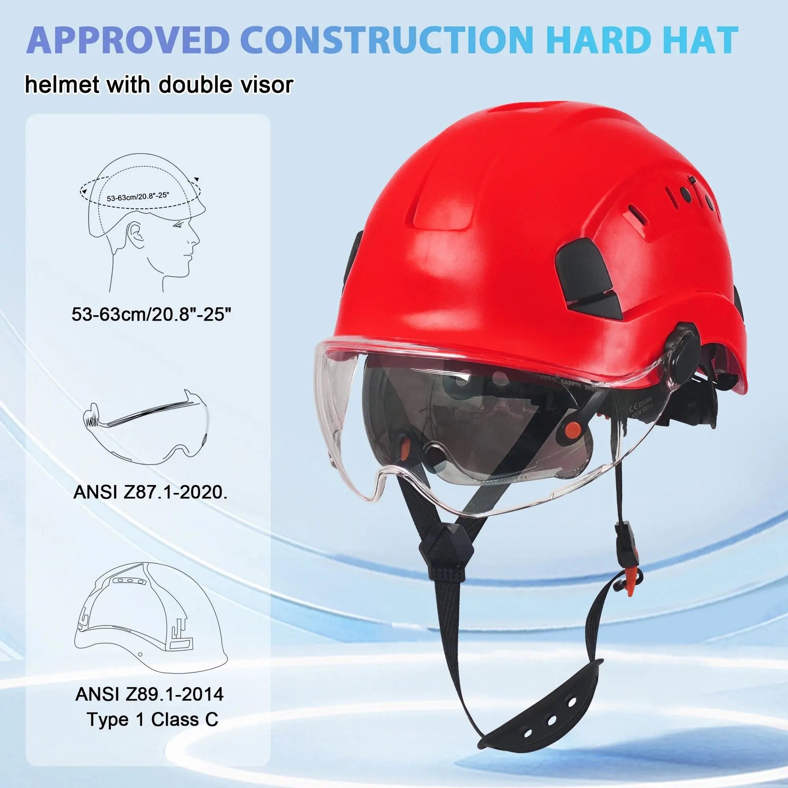 - 【APPROVED QUALITY】 construction hard hats for adults, made of high-impact ABS and PC material, lightweight, strong, and comfortable. Safety helmet approved with ANSI Z89.1-2014 Type 1 Class C, and visor eye shield approved with ANSI Z87.1-2020. The helmet with a visor is also approved by CE ( EN397: 2012+A1: 2012 ) certified and is the perfect barrier against penetration in construction work for men and women.