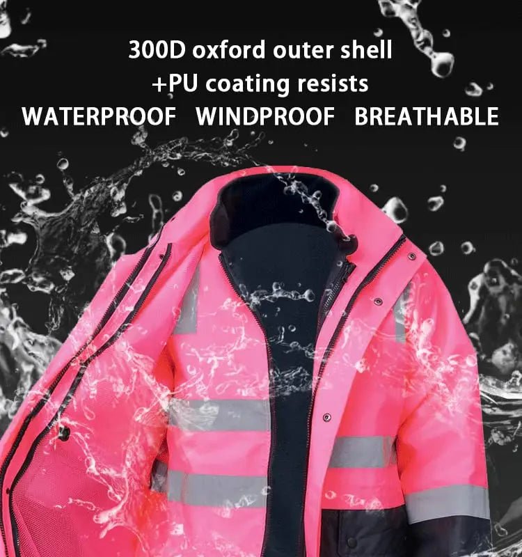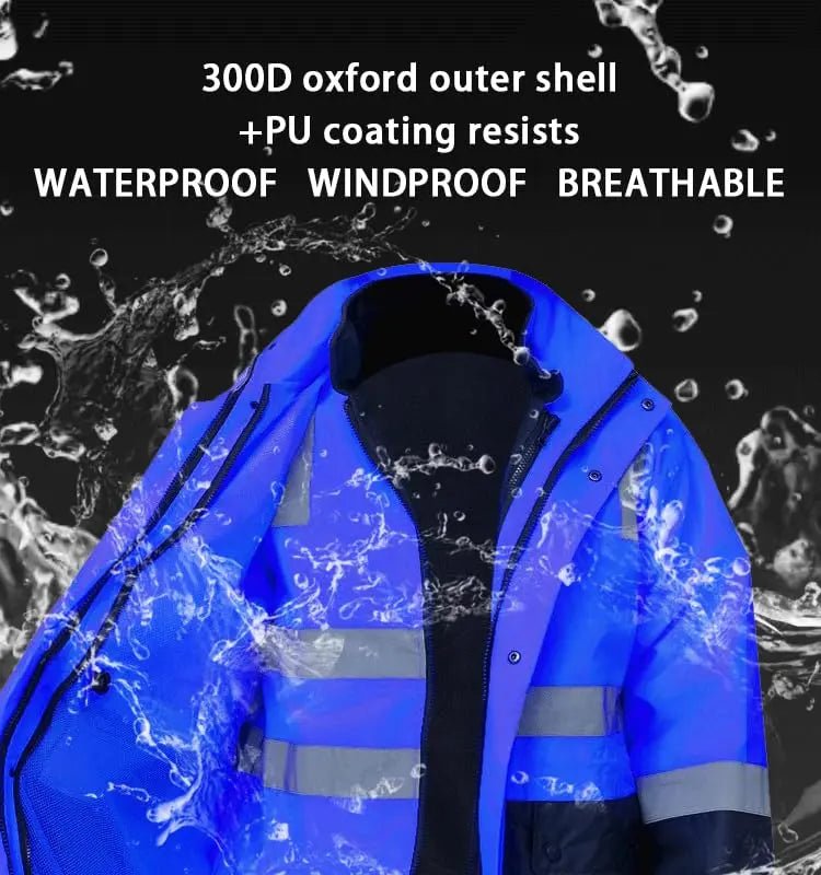 - WATERPROOF & REFLECTIVE: Silver StarTech reflective tape provides high visibility. The jacket is 100% waterproof and windproof, features a removable hood with a concealed pouch, and includes an inner detachable fleece liner. Its shell is made of premium PU-coated Oxford polyester.