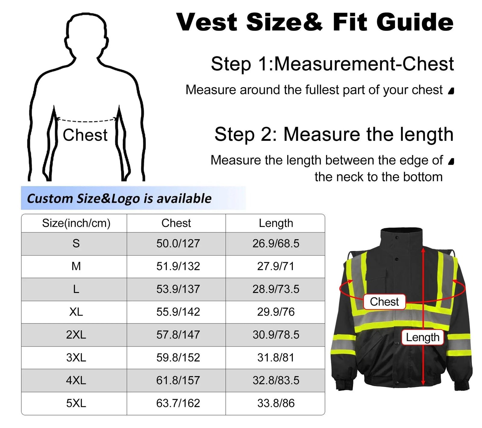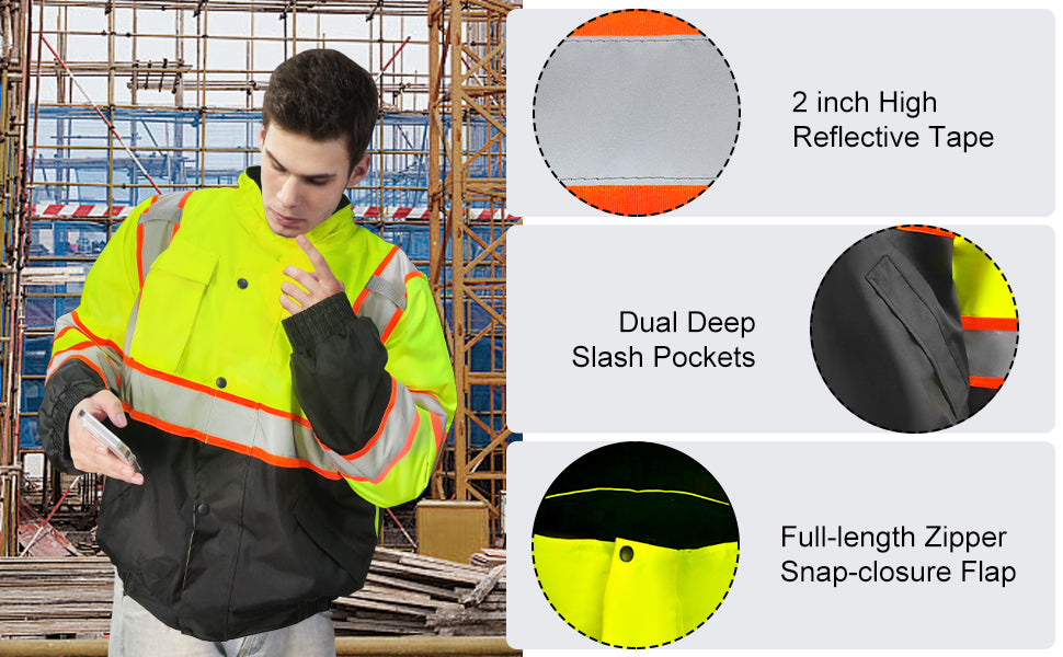 • Reflective Strips: 2 vertical and 1 horizontal reflective strips with 2“ width on both front and back for maximum visibility in all weather and light conditions.