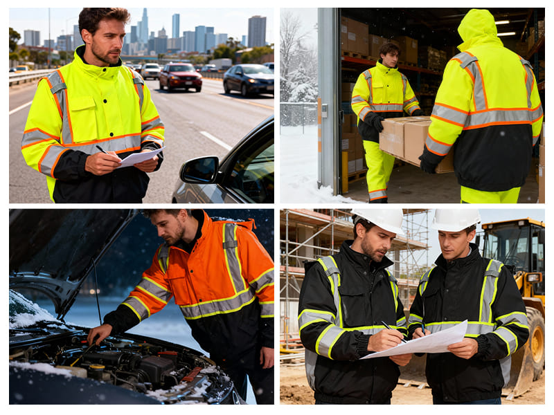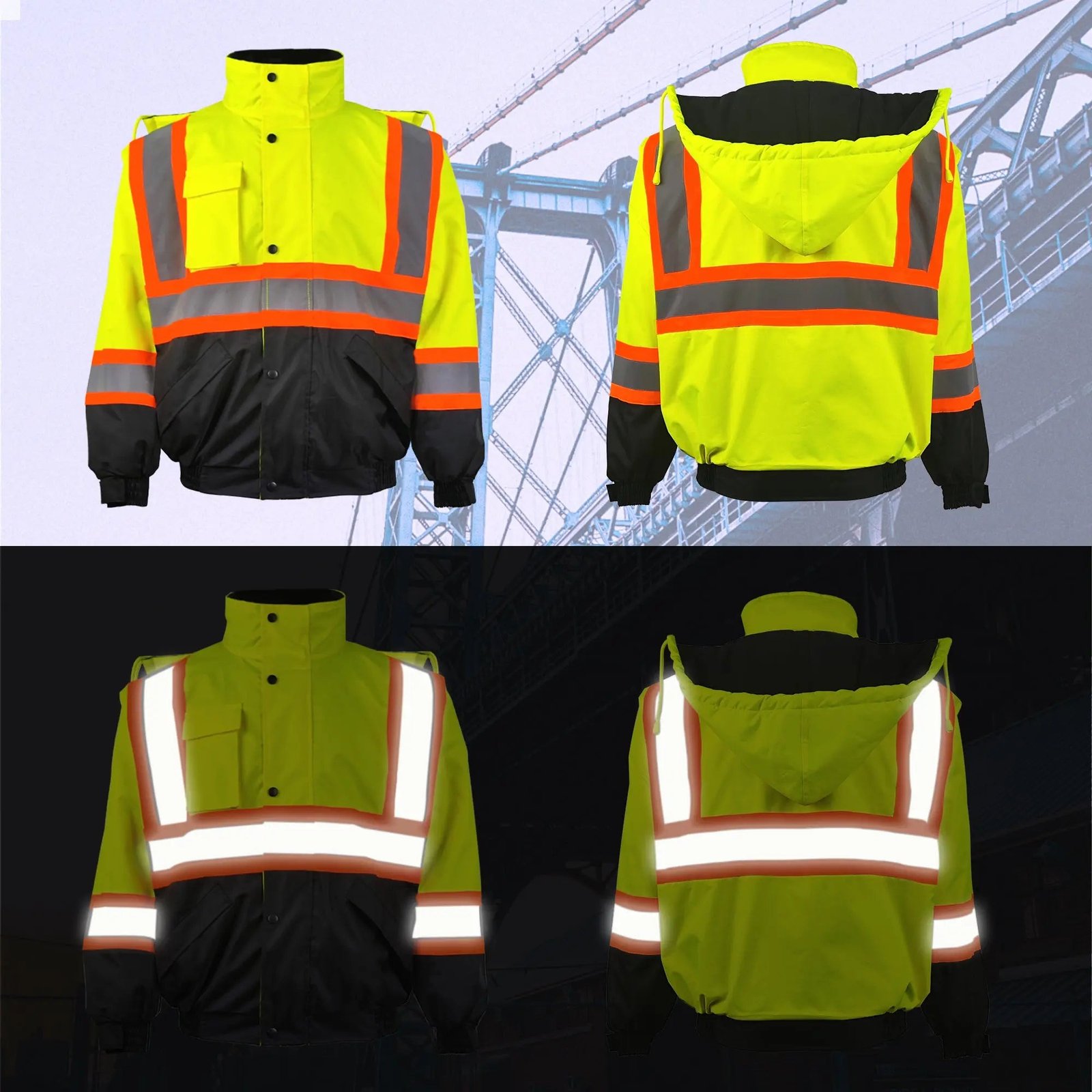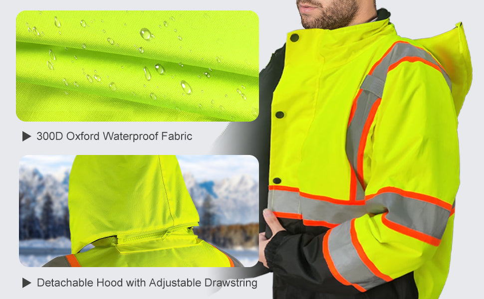 This reflective rain jacket is designed for use in ports, airports, highways, and other high-risk areas. It is ideal for construction workers, truck drivers, traffic police, security personnel and so on.